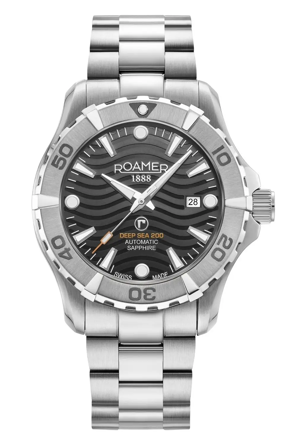 Nurkowy zegarek męski Roamer Deep Sea 200 Automatic 860983 41 55 70 to model, który łączy funkcjonalność czasomierza narzędziowego z nowoczesną, stylową formą. Zintegrowana bransoleta, masywna koperta i czarna tarcza z wytłoczonym wzorem fal budują design, który nie tylko przyciąga wzrok, ale też budzi zaufanie. Szkło szafirowe chroni tarczę przed zarysowaniami, a bransoleta z pełnych ogniw została zakończona bezpiecznym zapięciem motylkowym.