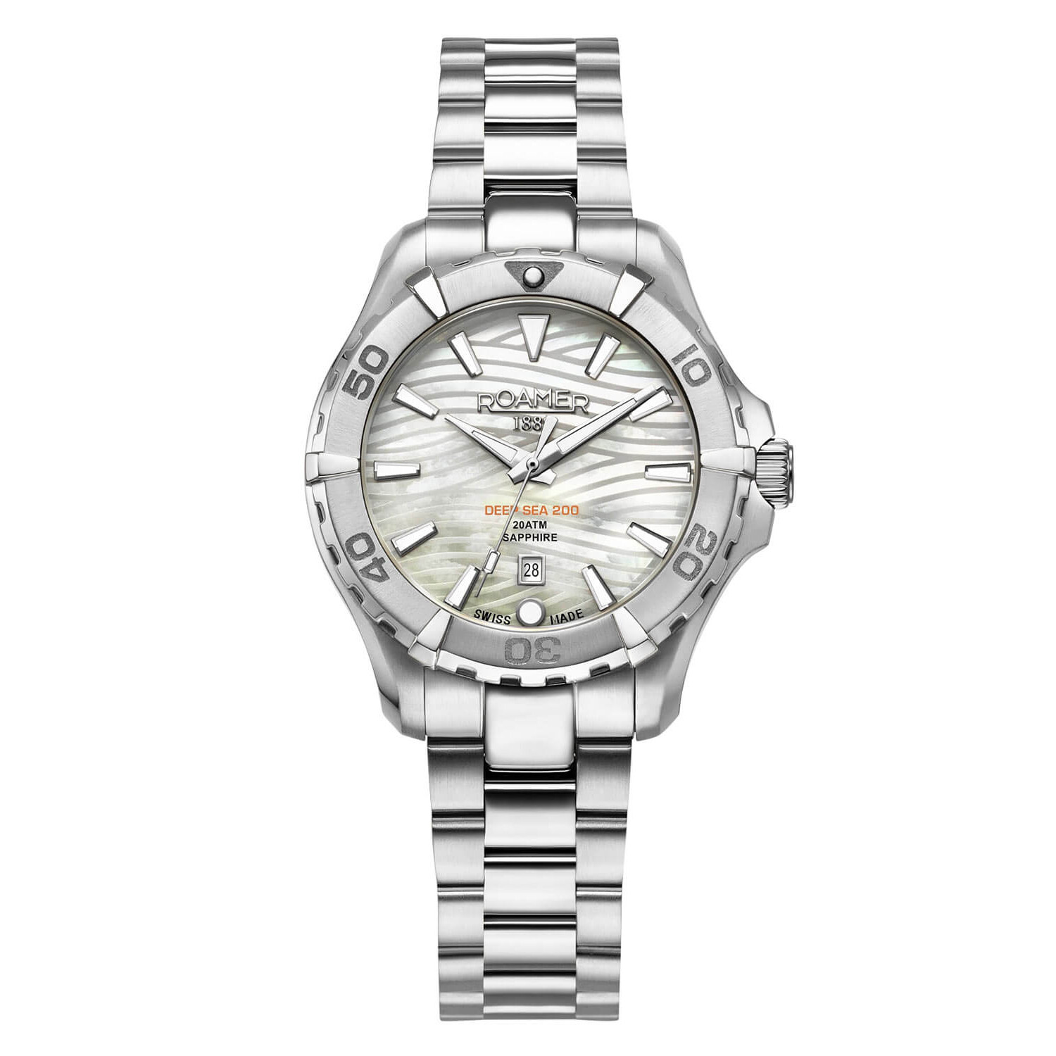 Roamer Deep Sea 200 Lady to stalowa koperta z klasą szczelności do 200 metrów. Model ten uzupełnia obrotowy bezel ze skalą minutową, która pomoże śledzić czas w chwili zanurzenia, zakręcany dekiel oraz koronka. Front to trudne do zarysowania szkło szafirowe, które skutecznie ochroni tarczę z masy perłowej przed uszkodzeniem. To, co wyróżnia tarczę to piękny wzór fal morskich, który mieni się zależnie od padającego światła. Model ten zawieszony jest na bransolecie, która wygodnie ułoży się na nadgarstku. Zegarek Roamer napędza szwajcarski mechanizm Ronda — znany i niezawodny układ zasilany jest baterią.