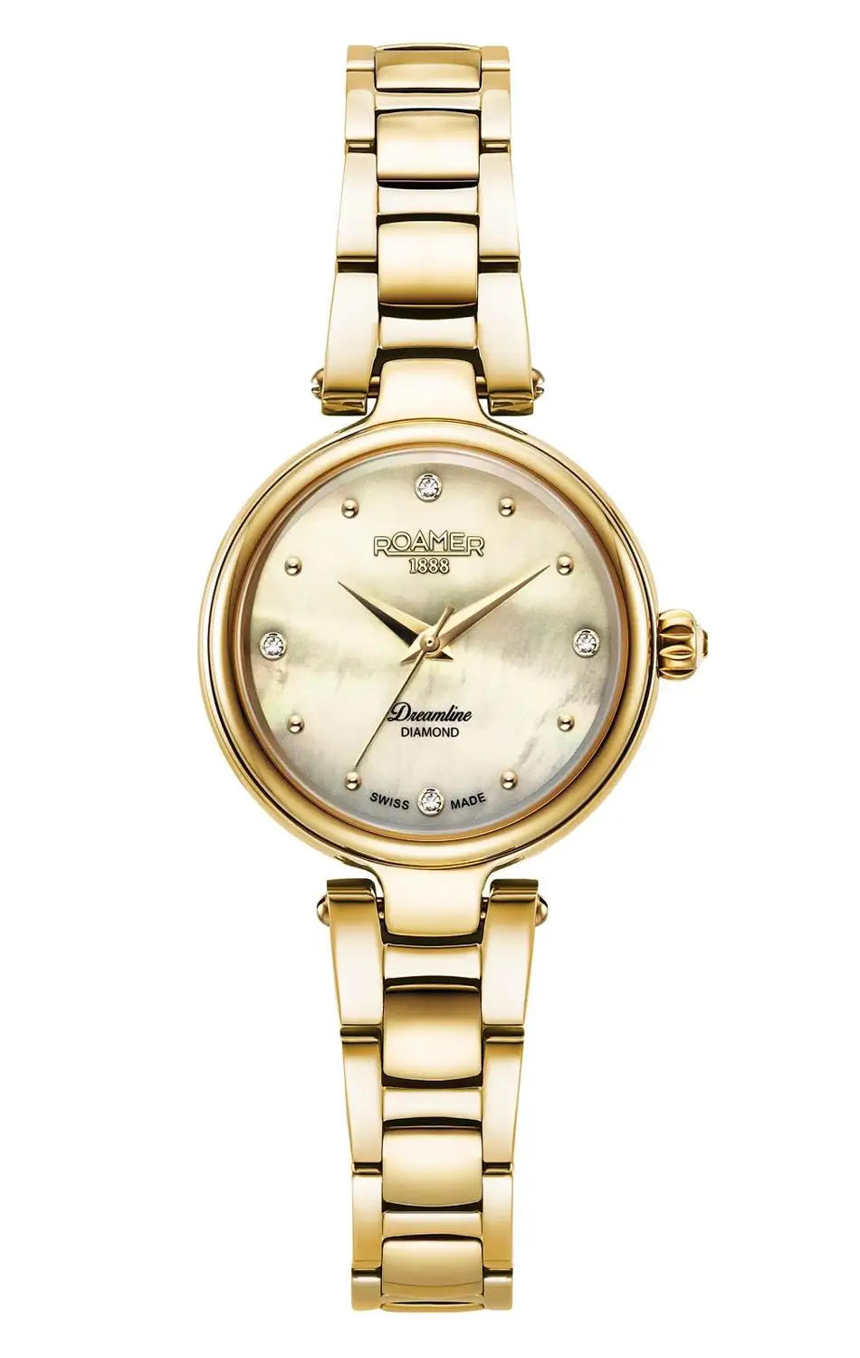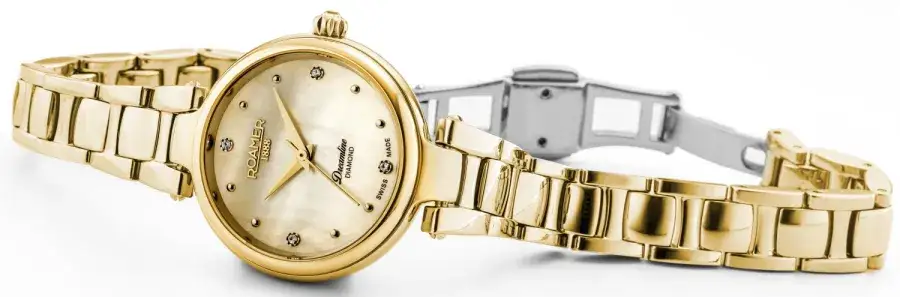 Roamer to elegancki zegarek damski o biżuteryjnym charakterze, z tarczą z masy perłowej ozdobioną sześcioma diamentami. Złocona koperta 28 mm i szwajcarski mechanizm kwarcowy tworzą stylową całość na każdą okazję.