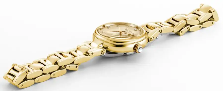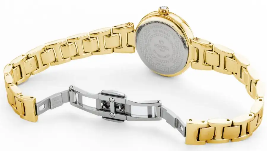 Koperta o średnicy 28 mm została wykonana z wysokogatunkowej stali nierdzewnej pokrytej złotą powłoką metodą PVD, co zapewnia trwałość koloru i odporność na codzienne użytkowanie. Tarcza z masy perłowej mieni się naturalnymi refleksami i została ozdobiona sześcioma prawdziwymi diamentami, pełniącymi funkcję indeksów. Całość zabezpiecza szkło szafirowe – odporne na zarysowania i doskonale przejrzyste. Wewnątrz pracuje szwajcarski mechanizm kwarcowy, który gwarantuje punktualność i niezawodność na co dzień. Model uzupełnia elegancka bransoleta zakończona zapięciem motylkowym, co sprawia, że zegarek zakłada się z łatwością i z przyjemnością – każdego dnia.