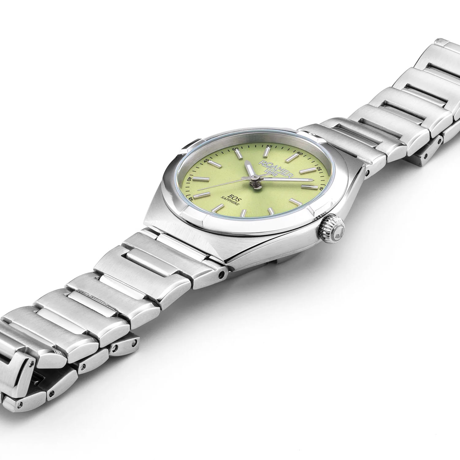 Zegarek Roamer 982847 41 75 20 na solidnej stalowej bransolecie wyróżnia się zastosowaniem niezwykle trwałego szkła szafirowego, odpornego na zarysowania i zapewniającego doskonałą czytelność tarczy. Pod tym wytrzymałym szkłem kryje się gustowna, jasnozielona tarcza, na której eleganckie stalowe wskazówki i smukłe indeksy przyciągają uwagę swoją precyzją i stylem. Dla zapewnienia widoczności w każdych warunkach elementy te zostały pokryte warstwą luminescencyjną Super-LumiNova®, która delikatnie rozświetla detale w słabym oświetleniu. Roamer EOS Classic to nie tylko symbol elegancji, ale także wyraz szwajcarskiej precyzji – serce zegarka napędza niezawodny mechanizm Ronda swiss made, gwarantujący dokładność i niezawodność przez długi czas.