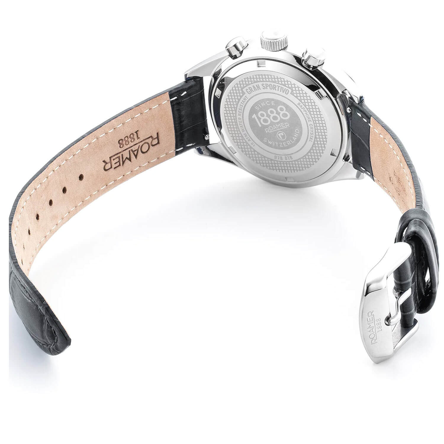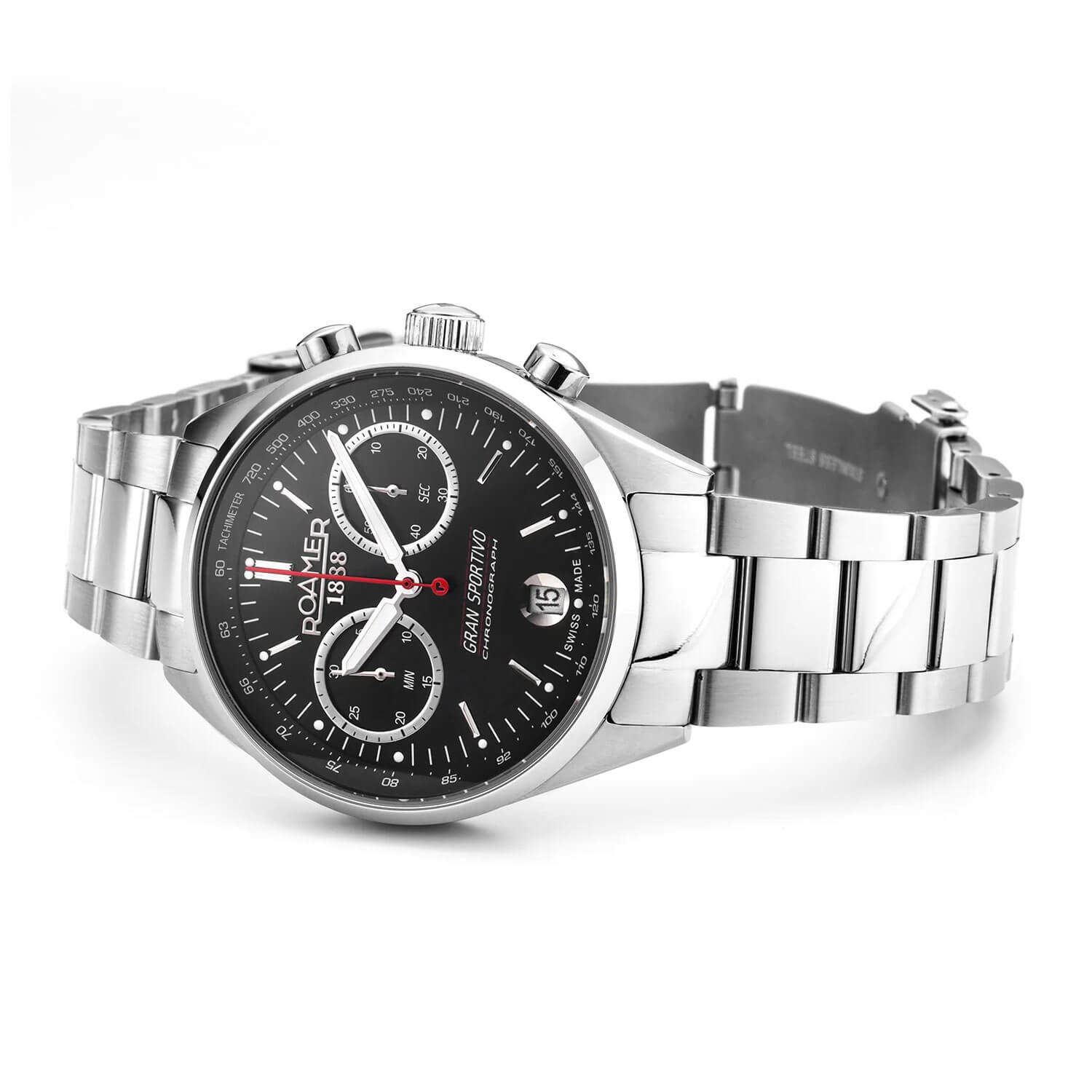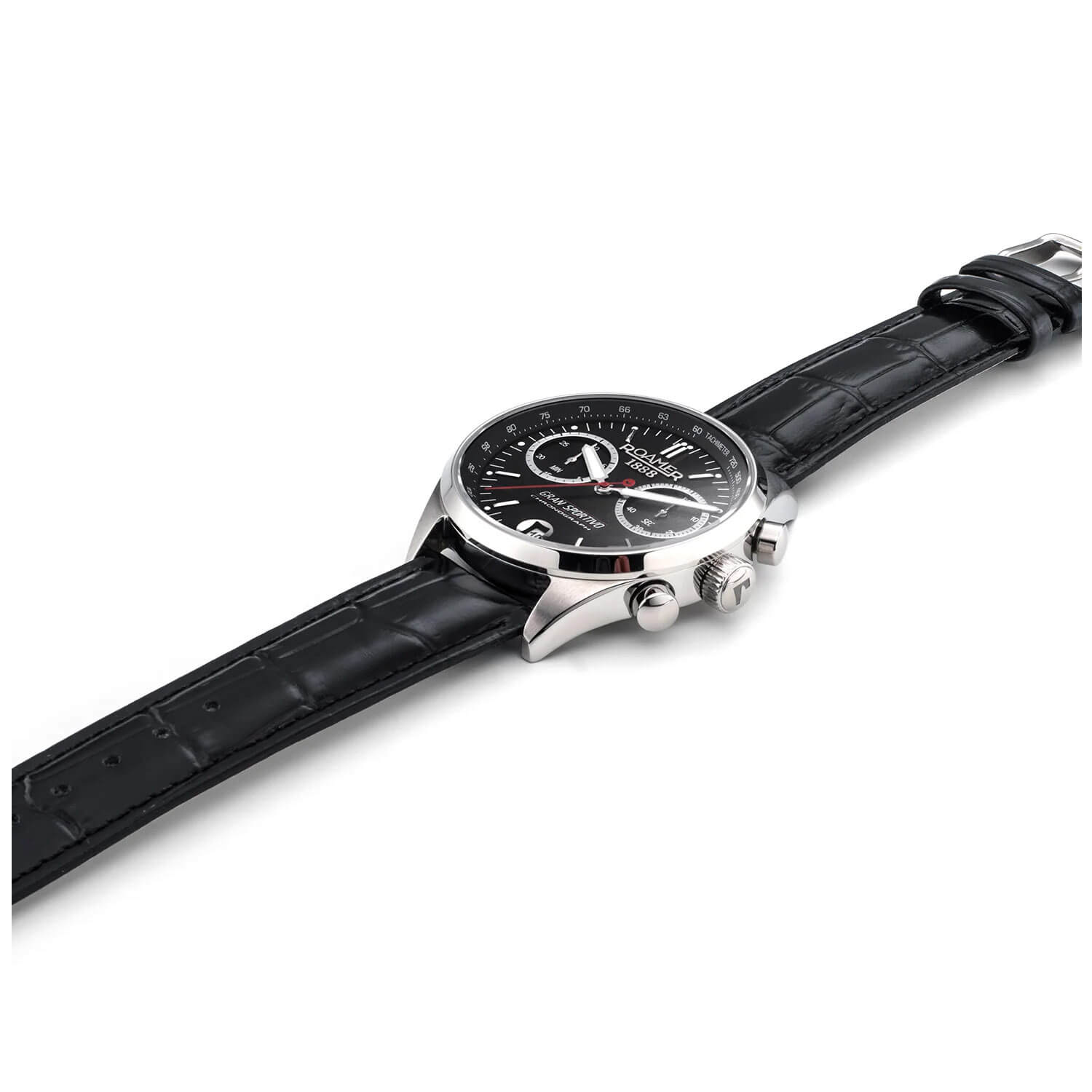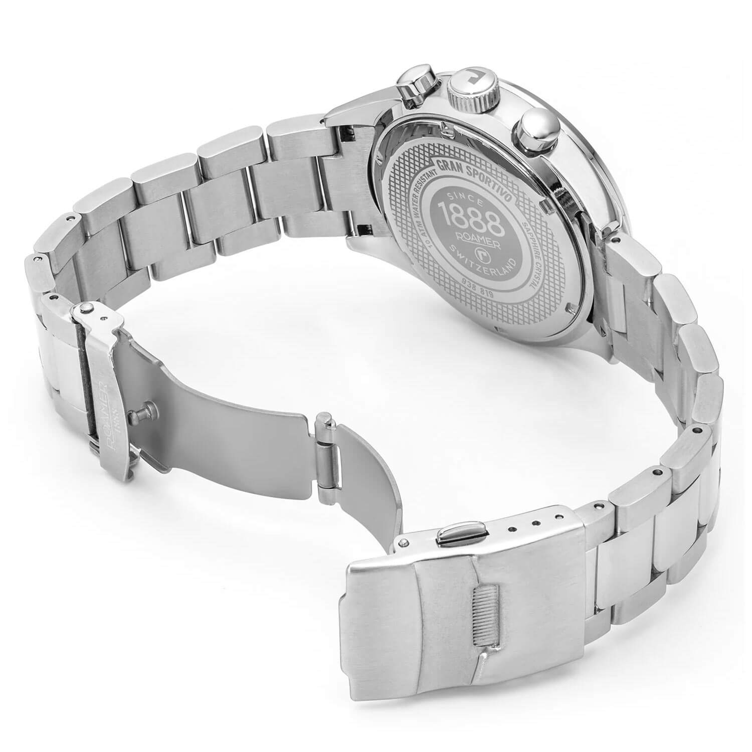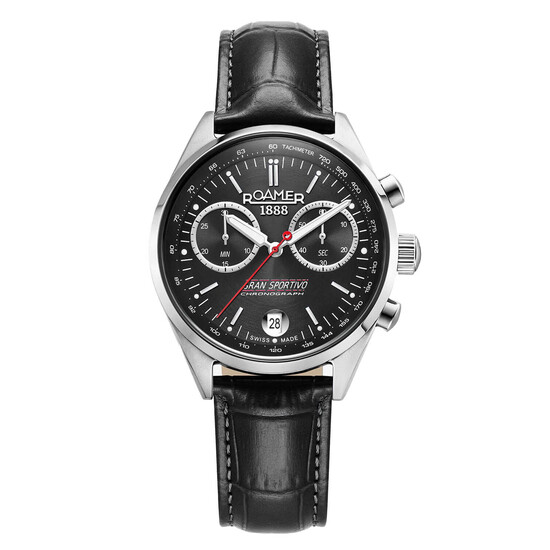 Tarcza limitowanego zegarka Roamer 978818 41 85 20 zachwyca modnym, klasycznym układem bi-compax, z dwiema subtarczami umieszczonymi powyżej głównej osi wskazówek. Masywne centralne wskazówki wypełniono substancją luminescencyjną, a drobne punkty tej samej substancji umieszczono na końcach godzinowych indeksów. Między nimi biegnie precyzyjna, biała skala minutowa. Pod osią wskazówek widnieje stylowy napis „GRAN SPORTIVO CHRONOGRAPH”. Centralna wskazówka sekundowa stopera jest czerwona i ozdobiona logo Roamer na końcu. Na pozycji godziny 6 znajduje się prostokątne okno datownika na okrągłym tle, które harmonizuje z pozostałymi, okrągłymi elementami stylistycznymi zegarka. Zewnętrzną krawędź wielowarstwowej tarczy zdobi matowy pierścień ze skalą tachometru. Srebrne obwódki otaczają dwie subtarcze z czarnymi podziałkami: 30-minutowy licznik stopera po lewej stronie oraz mały sekundnik zegarka po prawej.