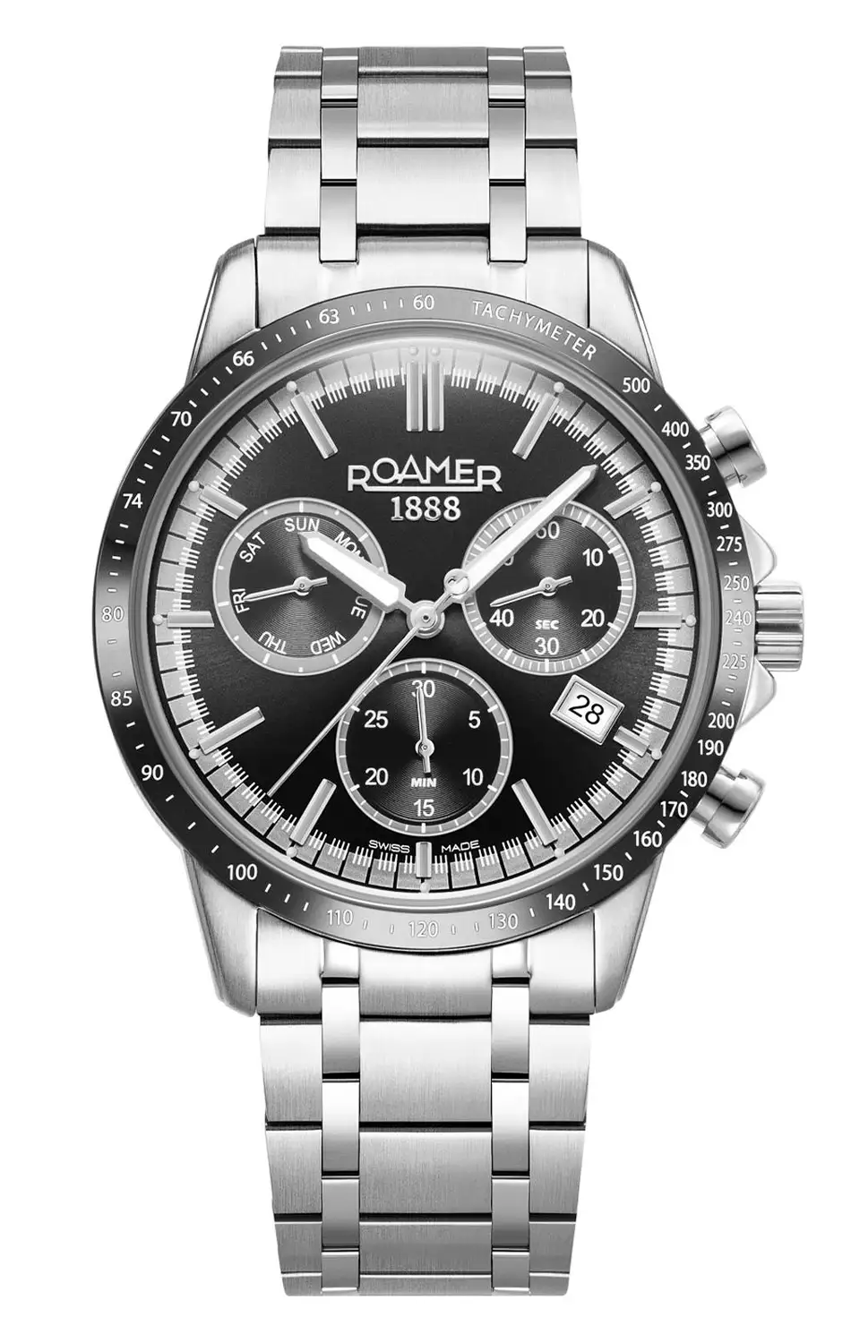 Sportowy zegarek męski Roamer z czarną tarczą i chronografem, który łączy precyzję z dynamicznym stylem. Tachymetr, datownik day-date i 100 m wodoszczelności czynią z niego praktyczne narzędzie na co dzień.