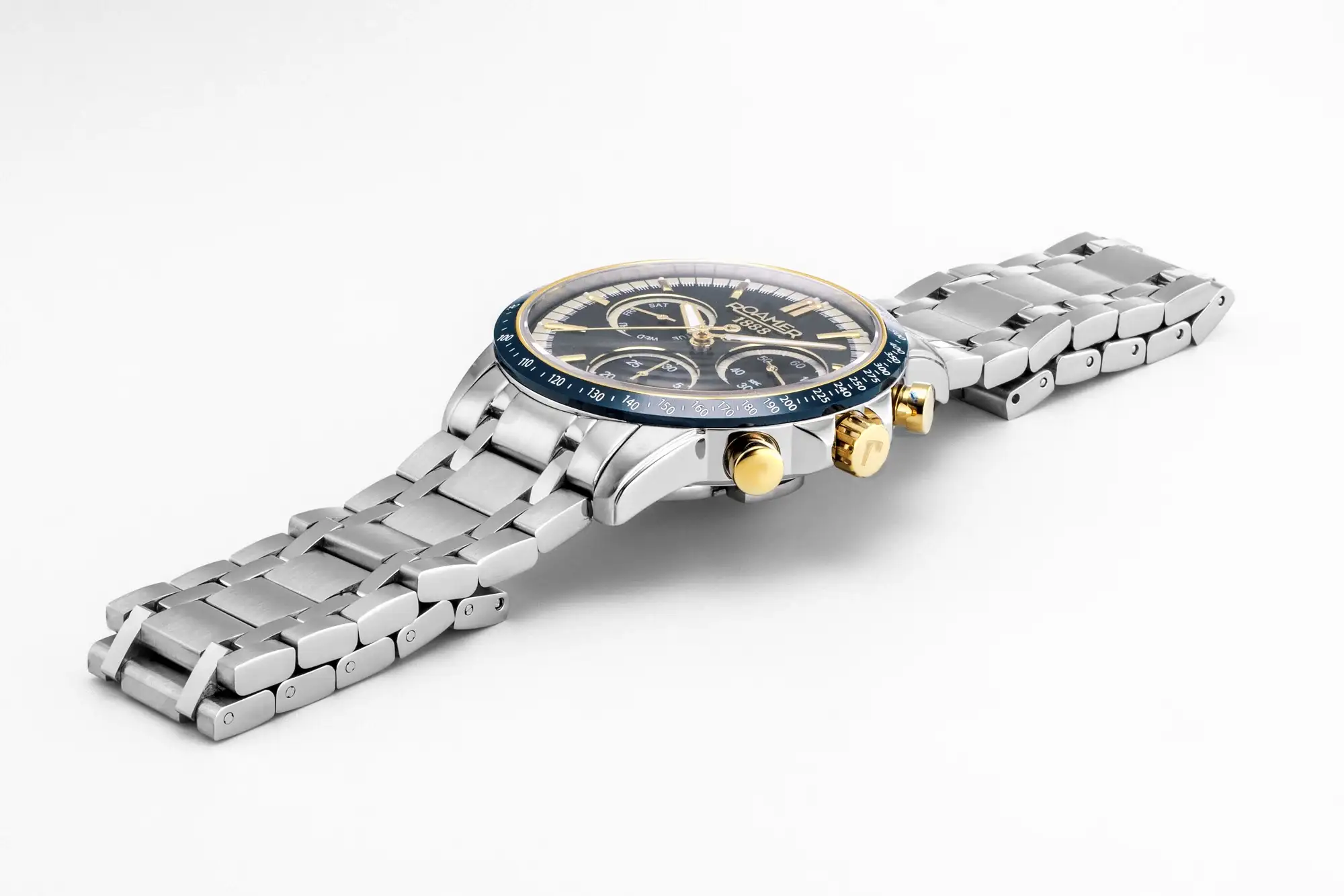 Na tarczy zegarka Roamer dominuje układ chronografu z precyzyjnymi totalizatorami minut i sekund, wspieranymi przez praktyczny wskaźnik dnia tygodnia oraz okienko datownika. Tachymetr umożliwia orientacyjny pomiar prędkości na podstawie przebytej odległości, co stanowi ukłon w stronę miłośników motoryzacji i sportów dynamicznych. Pozłacane przyciski po prawej stronie koperty zapewniają szybki dostęp do funkcji stopera, a dzięki wysokiej czytelności i wyraźnym indeksom obsługa jest intuicyjna w każdej sytuacji. Całość dopełnia wodoszczelność na poziomie 100 metrów - wystarczająca, by nie martwić się o przypadkowy kontakt z wodą.