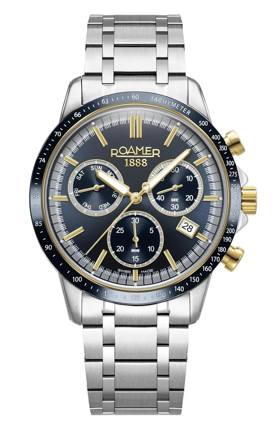 Sportowy zegarek męski Roamer z niebieską tarczą i chronografem, który łączy precyzję z dynamicznym stylem. Tachymetr, datownik day-date i 100 m wodoszczelności czynią z niego praktyczne narzędzie na co dzień. Koronka i przyciski chronografu ze złotą powłoką IP.