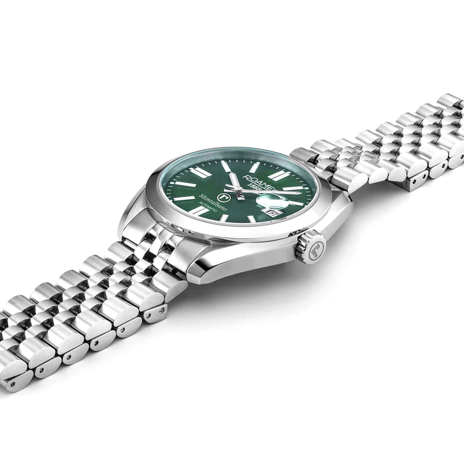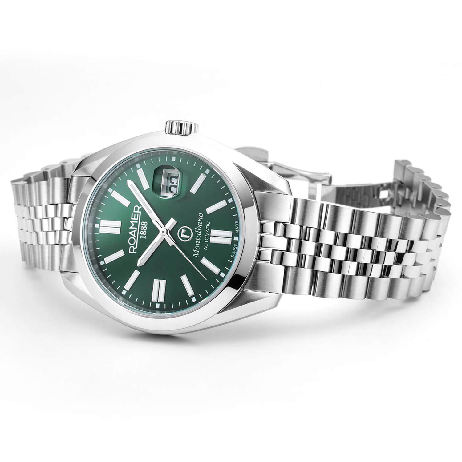 Automatyczny zegarek Roamer Montalbano Gents 996983 41 75 20 wyróżnia się elegancką tarczą w głębokim, intensywnym odcieniu butelkowej zieleni. Tarcza została ozdobiona starannie wykonanymi indeksami oraz wskazówkami pokrytymi powłoką luminescencyjną, co zapewnia wyjątkową czytelność nawet w słabym oświetleniu. Praktyczne okienko datownika, umieszczone na godzinie 3, dodaje funkcjonalności, ułatwiając codzienne korzystanie z zegarka. Sercem tego modelu jest niezawodny mechanizm automatyczny SOPROD P24, który gwarantuje precyzyjne odmierzanie czasu, będąc jednocześnie świadectwem najwyższej jakości szwajcarskiego zegarmistrzostwa. Połączenie doskonałego wykonania z wyrafinowanym designem sprawia, że Roamer Montalbano Gents jest idealnym wyborem dla osób ceniących elegancję i niezawodność w jednym.