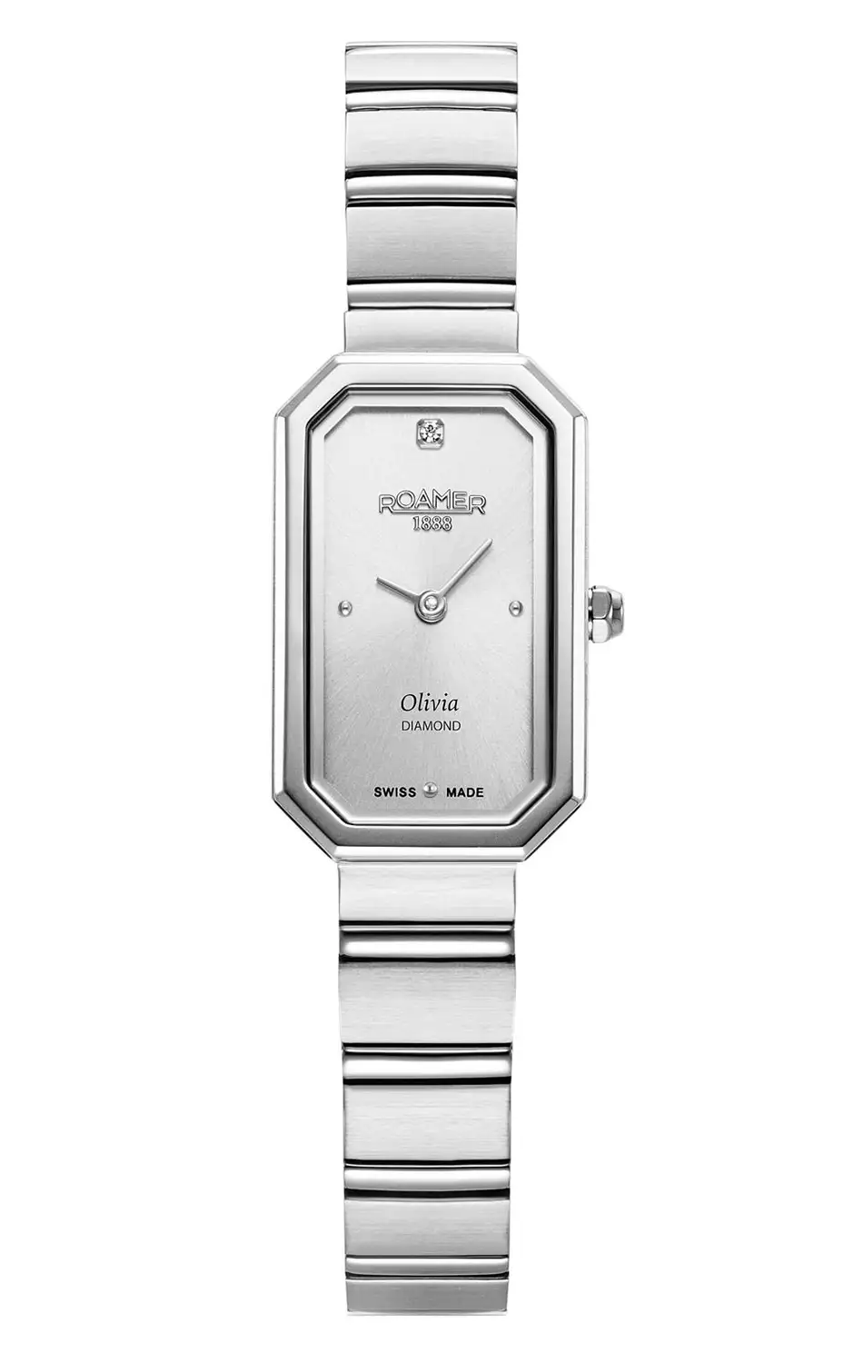 Zegarek damski z diamentem Roamer Olivia Diamond 627845 41 19 20 to propozycja dla kobiet, które cenią precyzję formy i świadomą elegancję zamkniętą w delikatnych proporcjach. Prostokątna koperta o wymiarach 18 mm x 29 mm, geometryczne linie i minimalistyczna tarcza Roamer z diamentem tworzą kompozycję, która nie potrzebuje dodatków, by przyciągać spojrzenia - wystarczy subtelny błysk światła, by wydobyć z niej pełnię charakteru.
