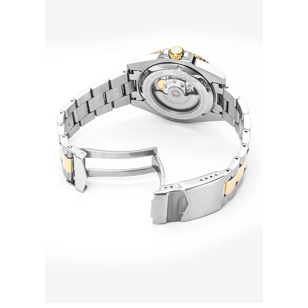 Męski zegarek Roamer Premier 986983478520 składa się z 42-milimetrowej koperty wykonanej ze stali nierdzewnej klasy 316L. Obudowa w kolorze srebrno-złotym uszczelniona została do 100 metrów. Odporność do 10 atmosfer zapewnia bezpieczeństwo mechanizmowi w czasie pływania. Po prawej stronie czasomierza tradycyjnie umieszczono koronkę. Jest ona zakręcana, co znacznie zwiększa odporność obudowy na wodę. Na rewersie zegarka Roamer wykorzystany został, zakręcany dekiel, który dopełnia szczelność całej konstrukcji. Środkowa część dekla to transparentne okno, które pozwala podziwiać prace mechanizmu. W obudowie zegarka Premier 986983 47 85 20 umieszczony został mechanizm automatyczny Soprod 24 napędzany ruchem nadgarstka swojego właściciela. Mechanizm szwajcarski Soprod posiada rezerwę chodu do 38 godzin, która pozwoli na chwilową przerwę w użytkowaniu czasomierza Roamer bez obawy o zatrzymanie jego pracy. Producent swój zegarek zestawił z bransoletą stalową bicolor, która posiada bezpieczne i komfortowe zapięcie motylkowe.