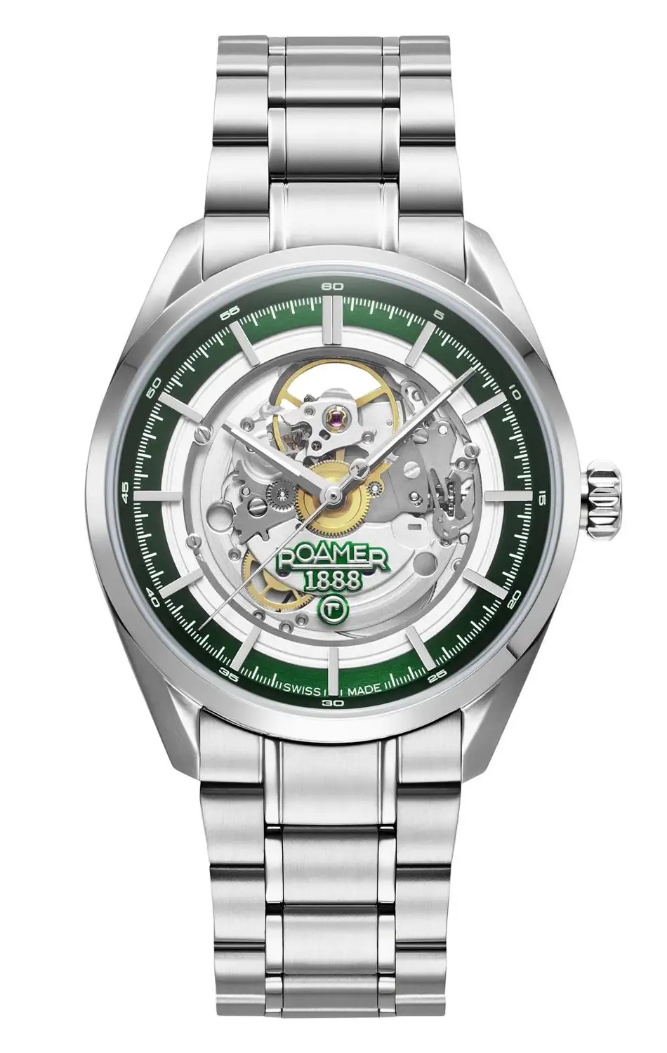 Zegarek z widocznym mechanizmem Roamer 965985417520 ukazuje piękno pracy automatycznego werku poprzez szkieletowaną tarczę z zielonym pierścieniem minutowym. Złożoność detali, widoczne koła przekładni i otwarta konstrukcja balansują między zegarmistrzowskim kunsztem a nowoczesną estetyką. Każde spojrzenie na ten zegarek przypomina o nieustannym ruchu - jego serce nie tylko bije, ale odsłania cały swój rytm. Całość osłania szkło szafirowe, które trudno zarysować.