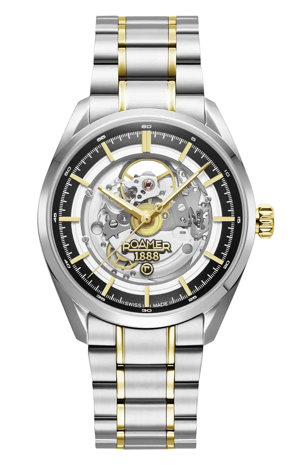Zegarek z widocznym mechanizmem Roamer 965985478520 bicolor ukazuje piękno pracy automatycznego werku poprzez szkieletowaną tarczę z czarnym pierścieniem minutowym. Złożoność detali, widoczne koła przekładni i otwarta konstrukcja balansują między zegarmistrzowskim kunsztem a nowoczesną estetyką. Każde spojrzenie na ten zegarek przypomina o nieustannym ruchu - jego serce nie tylko bije, ale odsłania cały swój rytm. Całość osłania szkło szafirowe, które trudno zarysować.