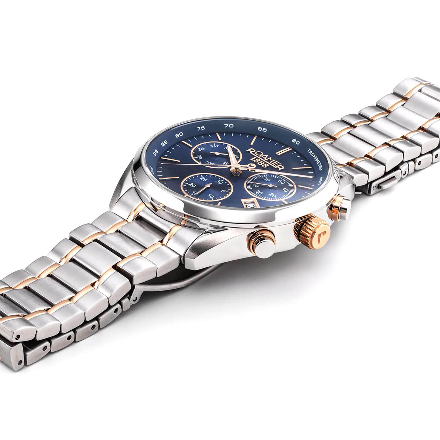 Sportowy zegarek Roamer Pro Chrono 993819474520 posiada niebieską tarczę o sportowym designie. Wyposażona jest w dwie subtarcze chronografu i trzecią dodatkową, która wskazuje dzień tygodnia. Tarcza srebrno-złotego zegarka Roamer chwali się niezwykłą funkcjonalnością. Na niej znajduje się również datownik z dniem miesiąca oraz skala tachymetru, która wskazuje prędkość poruszania się w odległości 1km. Dzięki świecącym w ciemności akcentom zegarek pozostaje czytelny nawet w słabym oświetleniu. Całość chroni trudne do zarysowania szkło szafirowe, które gwarantuje czytelność i bezpieczeństwo tarczy.