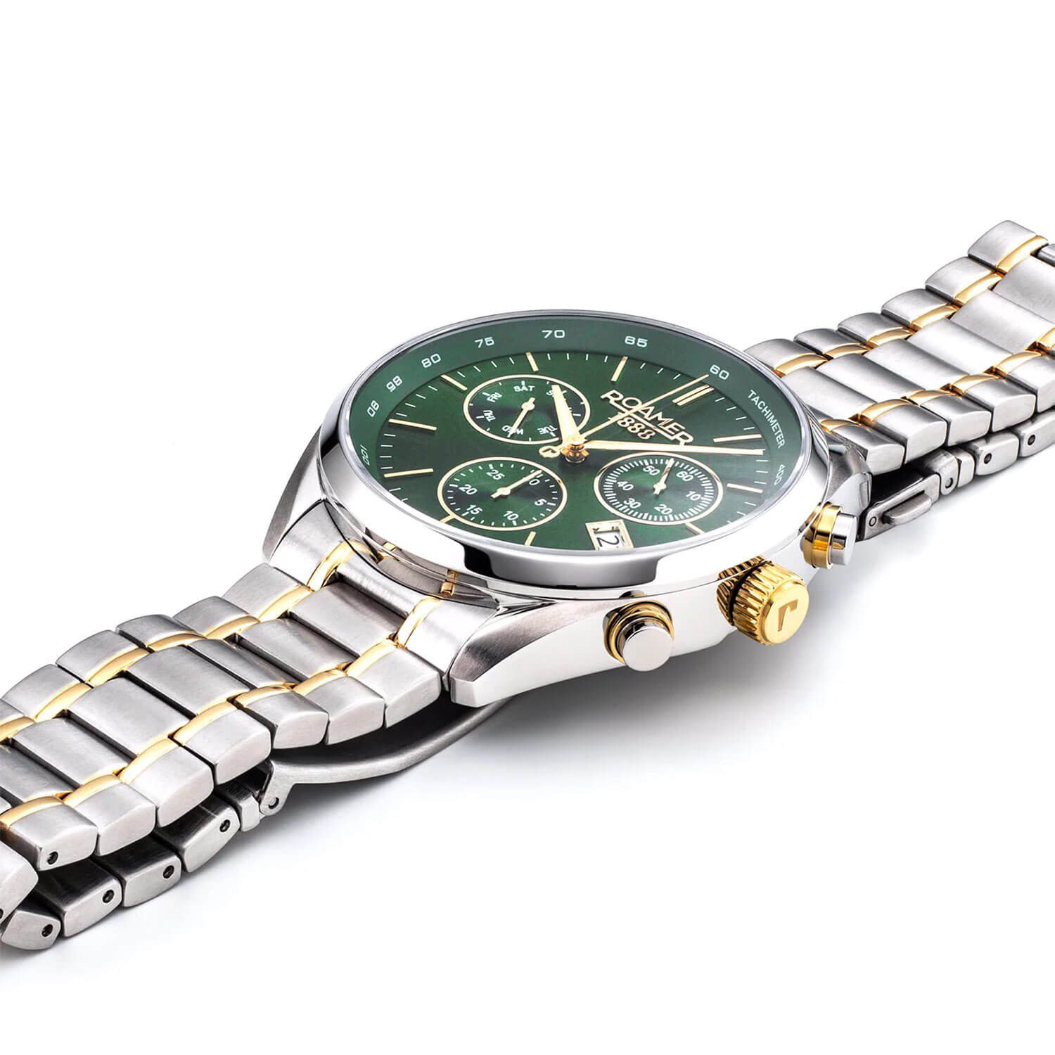 Sportowy zegarek Roamer Pro Chrono 993819477520 posiada zieloną tarczę o sportowym designie. Wyposażona jest w dwie subtarcze chronografu i trzecią dodatkową, która wskazuje dzień tygodnia. Tarcza srebrno-złotego zegarka Roamer chwali się niezwykłą funkcjonalnością. Na niej znajduje się również datownik z dniem miesiąca oraz skala tachymetru, która wskazuje prędkość poruszania się w odległości 1km. Dzięki świecącym w ciemności akcentom zegarek pozostaje czytelny nawet w słabym oświetleniu. Całość chroni trudne do zarysowania szkło szafirowe, które gwarantuje czytelność i bezpieczeństwo tarczy.