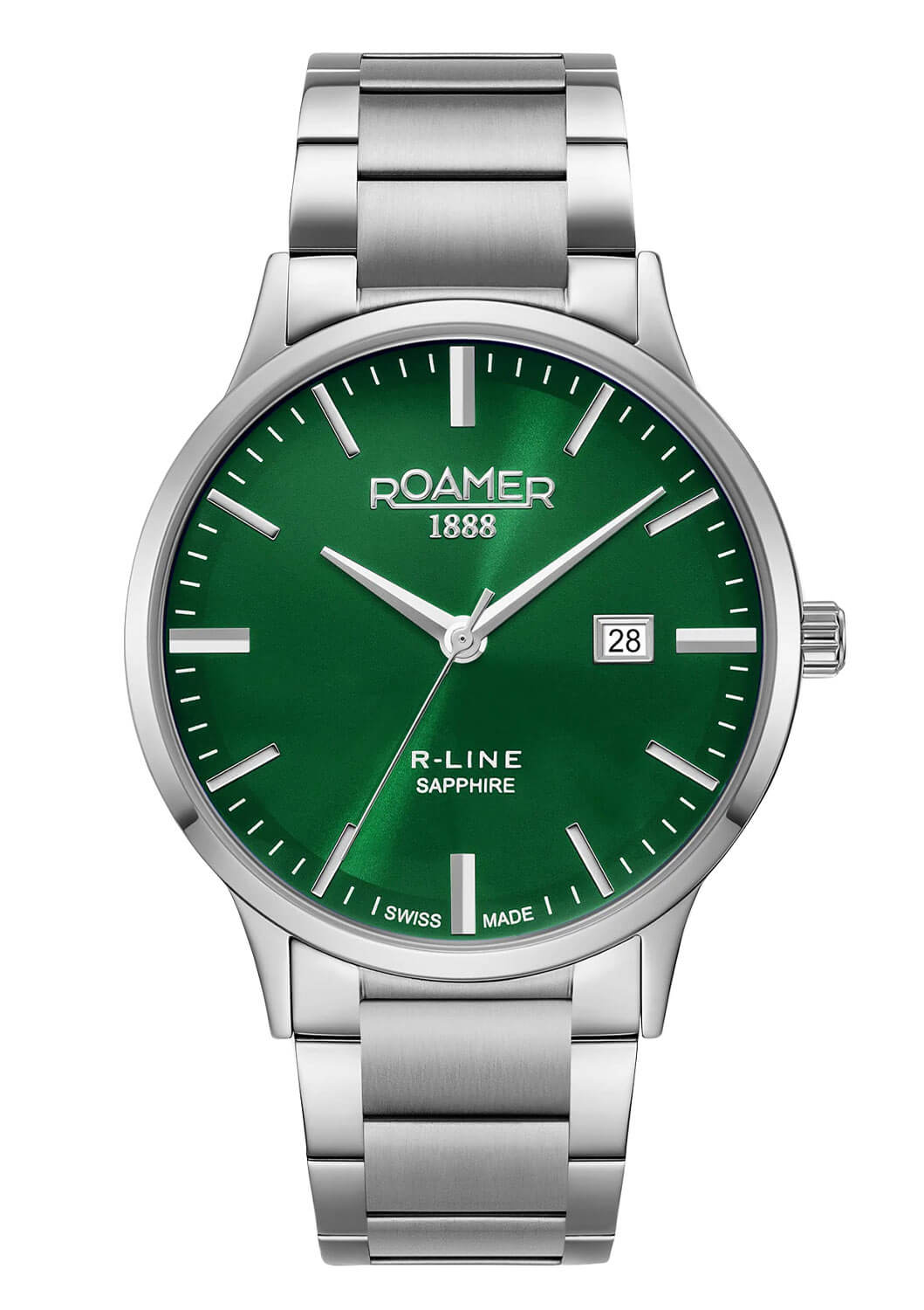 Na tarczy zegarka Roamer gustownie rozmieszczono srebrne, liniowe indeksy, które idealnie współgrają z klasycznymi wskazówkami o eleganckim i prostym designie. Minimalistyczne indeksy i subtelne logo Roamer 1888, umieszczone w górnej części tarczy, tworzą kompozycję, która odzwierciedla doskonałe rzemiosło i prestiż tej szwajcarskiej marki. Na godzinie trzeciej znalazł się dyskretny datownik, który wprowadza dodatkową funkcjonalność, jednocześnie zachowując symetryczną i elegancką estetykę. Butelkowozielona tarcza, wykończona delikatnym satynowym efektem, nadaje całości wyrafinowanego blasku, subtelnie odbijając światło pod różnymi kątami. Ten luksusowy detal sprawia, że zegarek wyróżnia się klasą i elegancją, przyciągając wzrok przy każdej okazji.