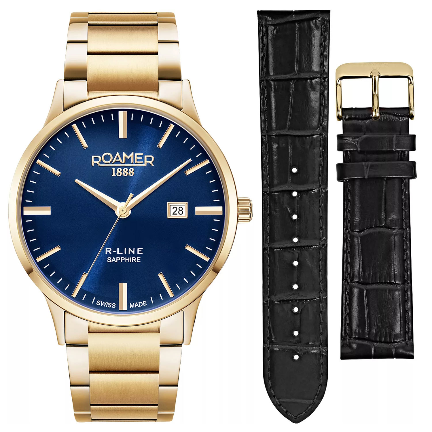 Szafirowe szkło chroni niebieską tarczę zegarka, ozdobioną pozłacanymi wskazówkami i liniowymi znacznikami, łącząc elegancję z czytelnością. Datownik na tarczy zwiększa praktyczność, a precyzyjny mechanizm Ronda Swiss Made zapewnia niezawodność i dokładność na lata. Pozłacany zegarek Roamer R-Line Classic 718833484571 to połączenie klasy i funkcjonalności. Szwajcarski zegarek Roamer w zestawie to elegancki, klasyczny model o czytelnym designie i modnej kolorystyce. Idealnie pasuje do różnych stylizacji, stanowiąc stylowe dopełnienie męskiej garderoby.