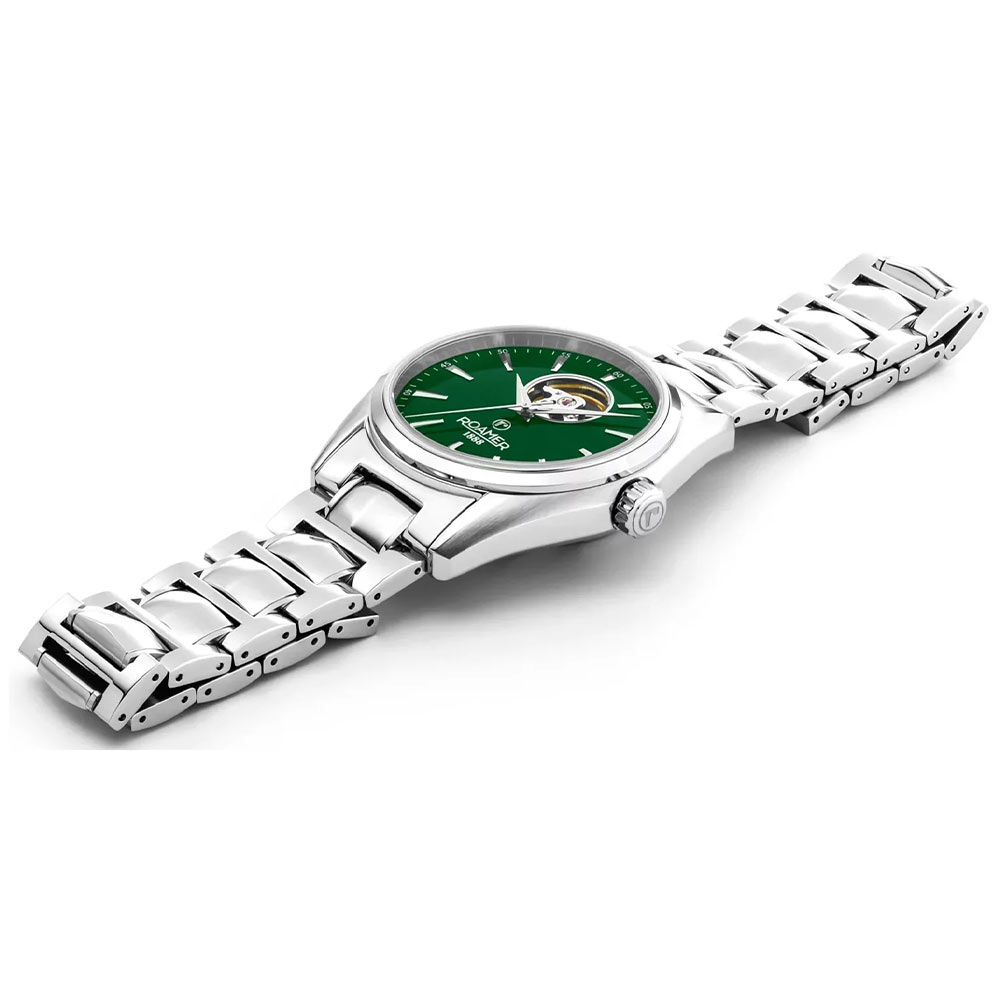 Męski zegarek Roamer Searock Master od frontowej strony zabezpieczony został twardym szkłem szafirowym. Wysoce odporny na zarysowania szafir zasłania wyjątkową tarczę typu open heart. Na zielonej tarczy w centralnym punkcie zainstalowane zostały sztyletowe wskazówki, które w parze z indeksami wskazują aktualną godzinę. Dolna część tarczy ozdobiona jest logiem marki Roamer. Godzina dwunasta to otwarty balans — odsłonięte serce. Tarcza open heart pozwala obserwować ruchy mechanizmu zegarka oraz jest ważnym elementem, który nadaje atrakcyjności temu modelowi.