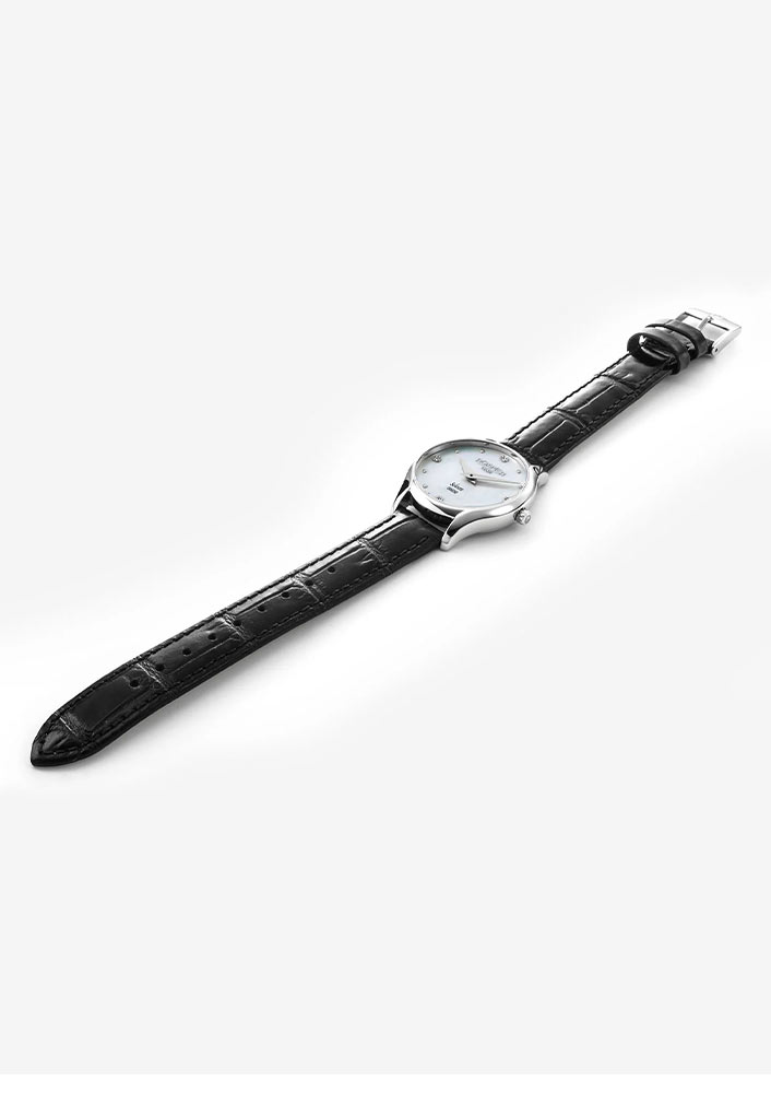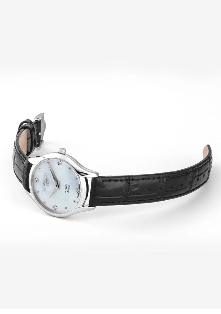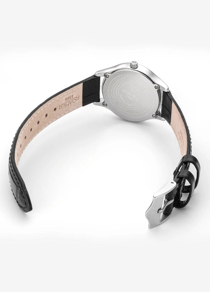 Damski zegarek Roamer Soleure Diamond 547857 41 25 05 składa się z okrągłej koperty wykonanej ze stali szlachetnej klasy 316L. Bezel 30-milimetrowej koperty charakteryzuje się wycięciami przy uszach, które wzbogacają design całej obudowy. Na rewersie umieszczony został stalowy dekiel, który przykręcony jest czterema śrubami. Ten elegancki czasomierz damski Roamer zestawiony został z paskiem skórzanym w kolorze czarnym z egzotycznym wzorem. Pasek jest lekki i miękki, co zapewni komfort w czasie użytkowania zegarka. Zapiąć go można dzięki tradycyjnej klamerce z igłą.