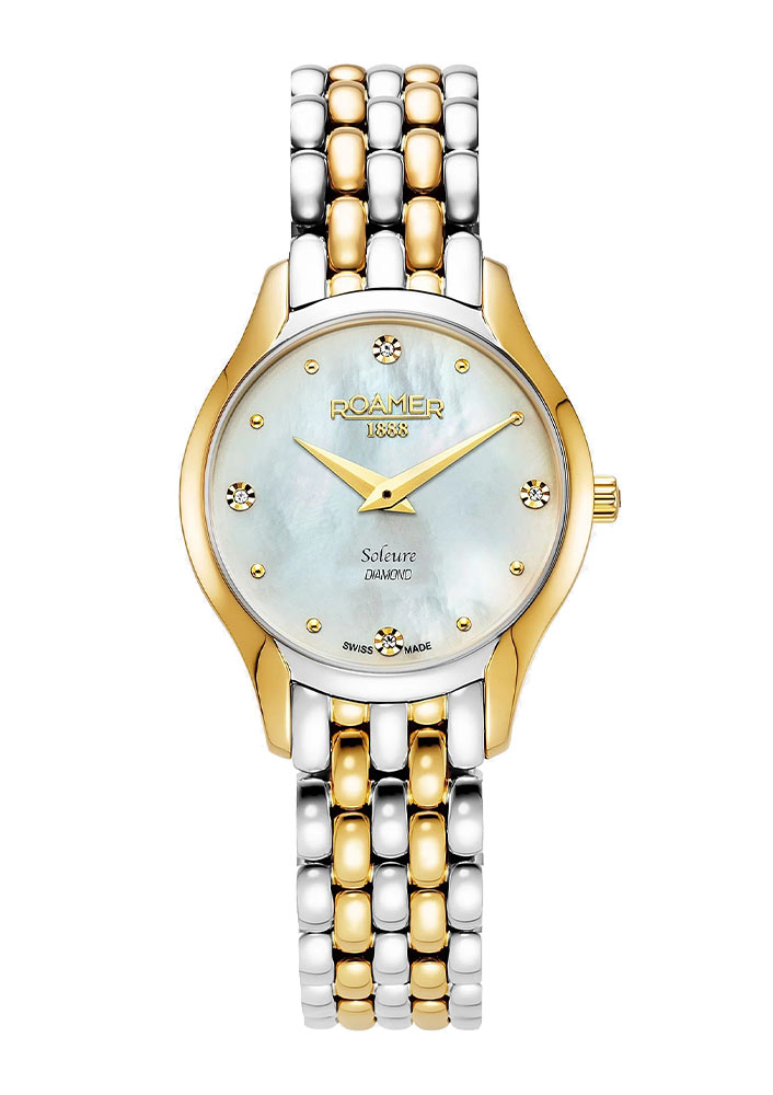 Front zegarka Roamer zabezpieczony jest twardym szkłem szafirowym. Trudne do zarysowania okno chroni niezwykle bogatą w ozdoby tarczę. Na okrągłym dysku wykonanym z masy perłowej umieszczone zostały olśniewające cztery prawdziwe diamenty. Diamentom towarzyszą delikatne okrągłe indeksy w kolorze srebrnym. Aktualny czas wskazują smukłe sztyletowe wskazówki. Godzinę dwunastą zdobi dumne logo marki Roamer 1888, a szóstą nazwa kolekcji Soleure Diamond. Unikatowa wzornictwem perłowa tarcza przykrywa szwajcarski mechanizm Ronda, która gwarantuje bardzo dobrą pracę odmierzania czasu.