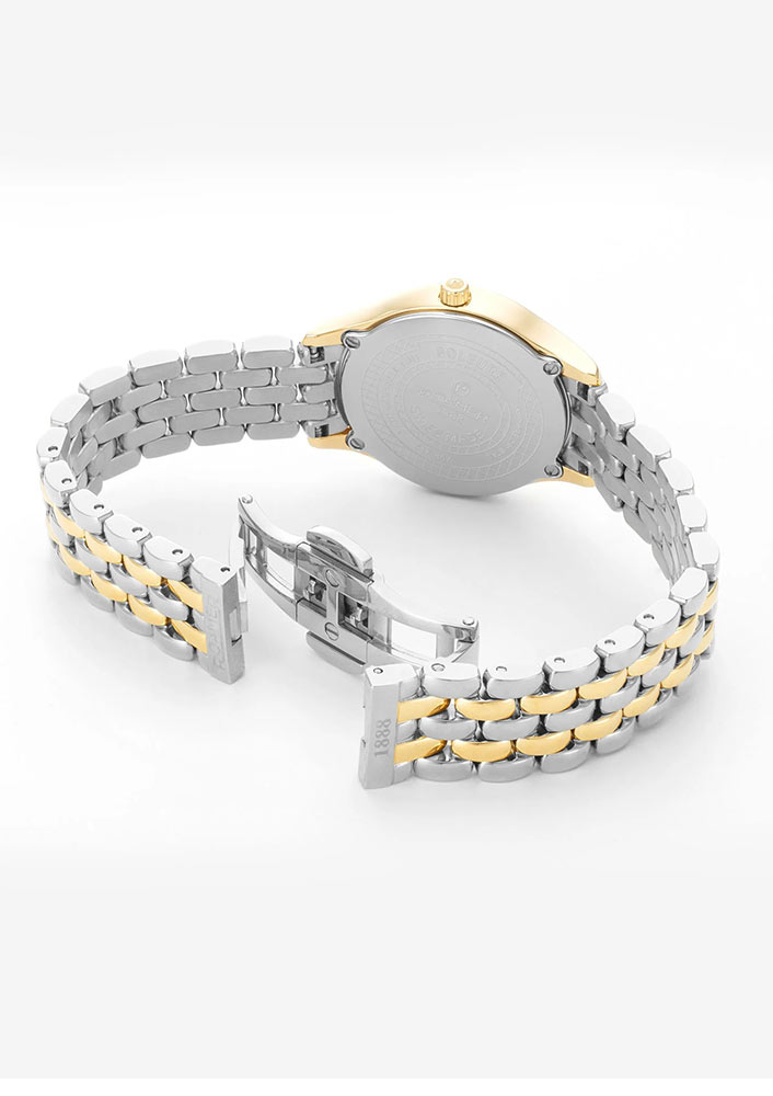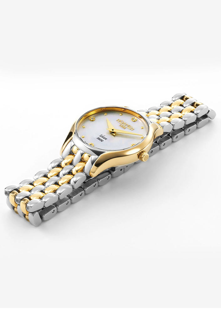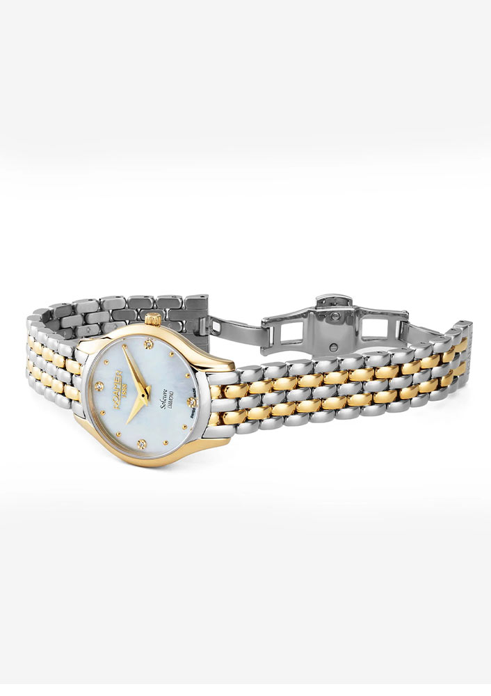 Damski zegarek Roamer Soleure Diamond 547857 47 25 50 składa się z okrągłej koperty wykonanej ze stali szlachetnej klasy 316L w kolorze złotym PVD. Bezel 30-milimetrowej koperty charakteryzuje się wycięciami przy uszach, które wzbogacają design całej obudowy. Na rewersie umieszczony został stalowy dekiel, który przykręcony jest czterema śrubami. Ten elegancki czasomierz damski Roamer zestawiony został ze stalową bransoletą bicolor. Wyposażona została w zapięcie motylkowe, co zapewni komfort w czasie użytkowania zegarka.