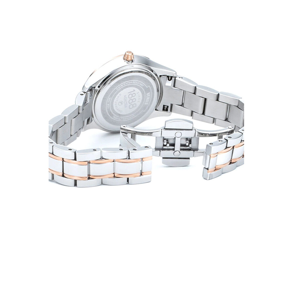 Roamer Venus Diamond to elegancki zegarek damski na dwukolorowej bransolecie z wysokogatunkowej stali nierdzewnej, pokryty odporną powłoką jonową IP na wskazówkach, indeksach, pierścieniu i ogniwach. Cyferblat zakryty jest najwyższej jakości, nierysującym się szkłem szafirowym. Wytrzymała koperta o średnicy 30 milimetrów kompetentnie chroni znajdujący się wewnątrz, szwajcarski mechanizm kwarcowy (na baterię). Tarcza zniewala mieniącymi się odcieniami białej masy perłowej oraz diamentem osadzonym na pozycji godziny 12 niczym klejnot koronny. Atrakcyjna wizualnie jest nawet nazwa kolekcji umieszczona poniżej polerowanych wskazań o fazowanej krawędzi.