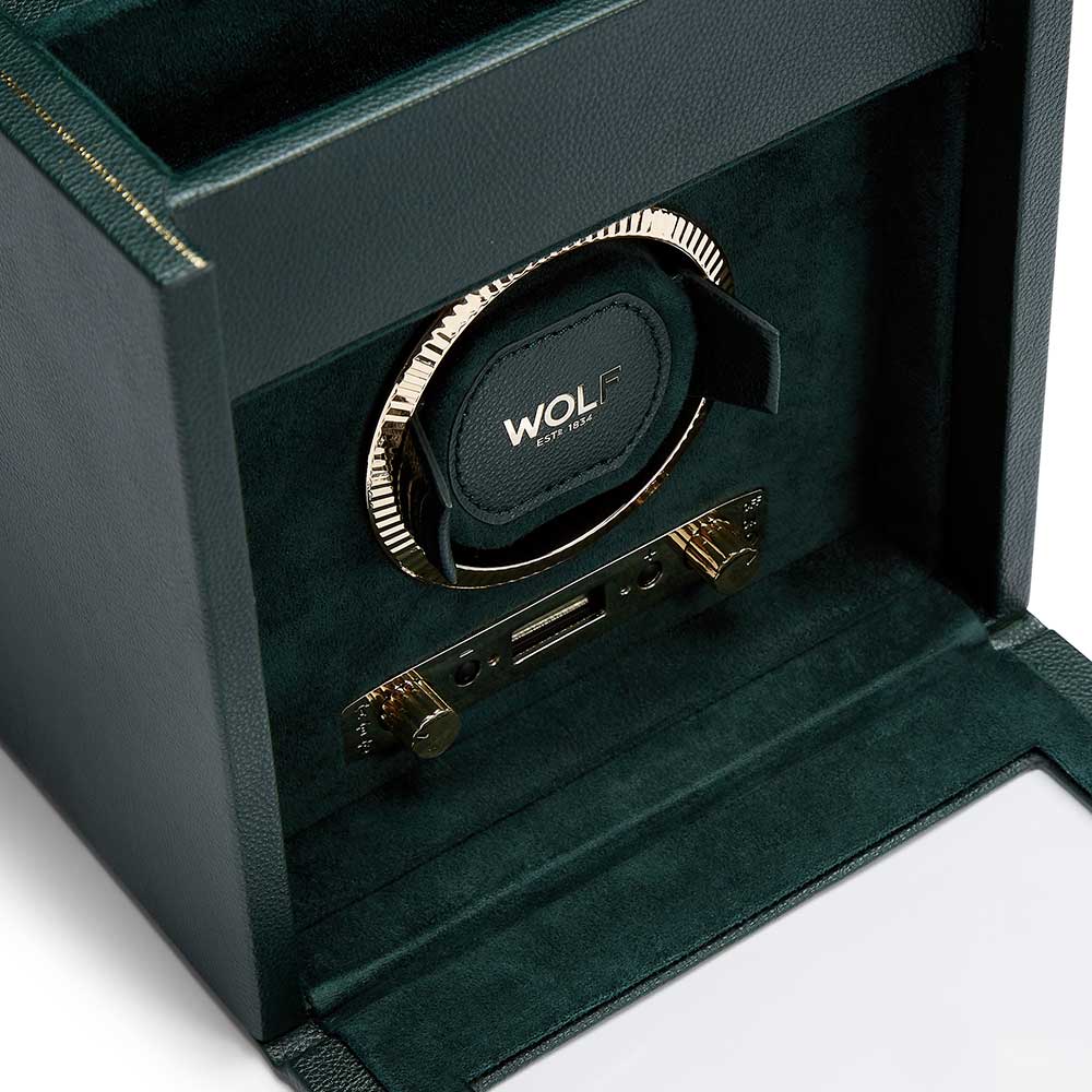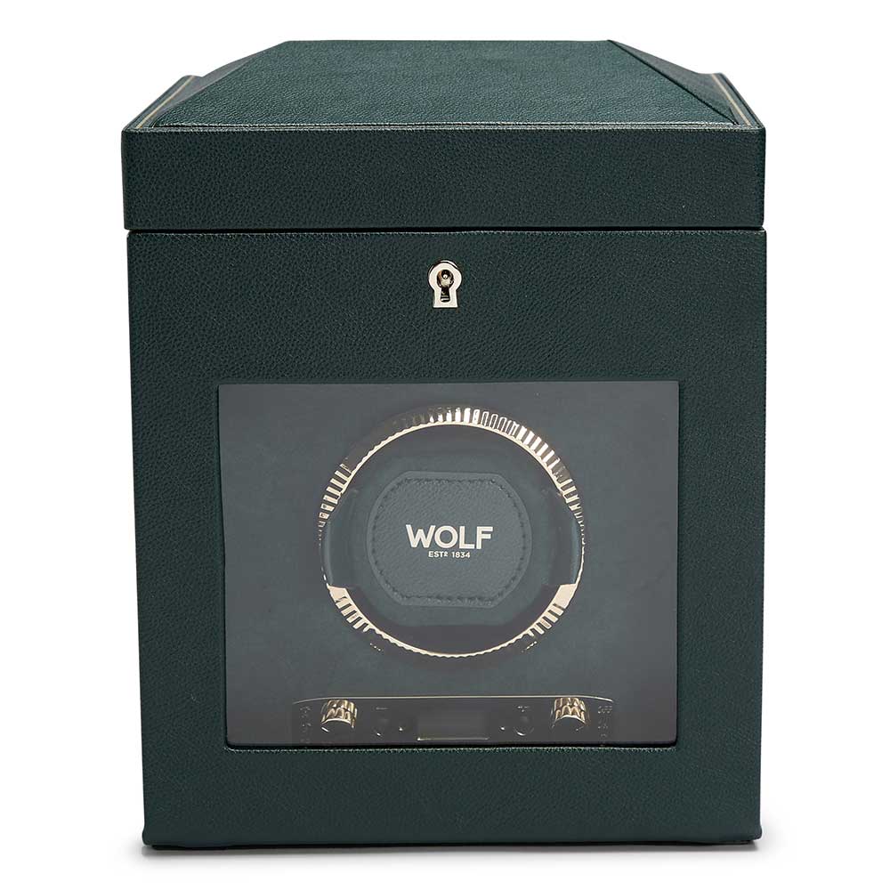 Wysokiej jakości rotomat WOLF British Racing 792141 do nakręcania zegarka z naciągiem automatycznym. Zielony kolor nawiązuje do historycznych, brytyjskich samochodów wyścigowych z początku XX wieku. Ręcznie wykonana obudowa z najwyższej jakości skóry wegańskiej ozdobiona elementami w kolorze złota. Szklana szyba chroni zegarek oraz wnętrze rotomatu przed kurzem i zabrudzeniami. Możliwość zamknięcia nawijarki za pomocą kluczyka. Ekskluzywny design rotomatu WOLF British Racing sprawia, że jest jednym z najchętniej wybieranych modeli na rynku akcesoriów do zegarków automatycznych. Na szczycie obudowy znajduje się schowek na dodatkowe dwa zegarki.
