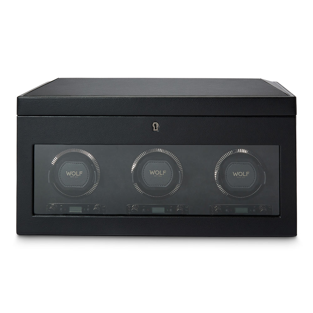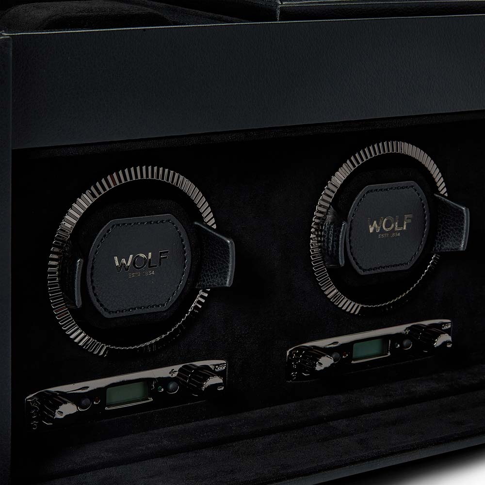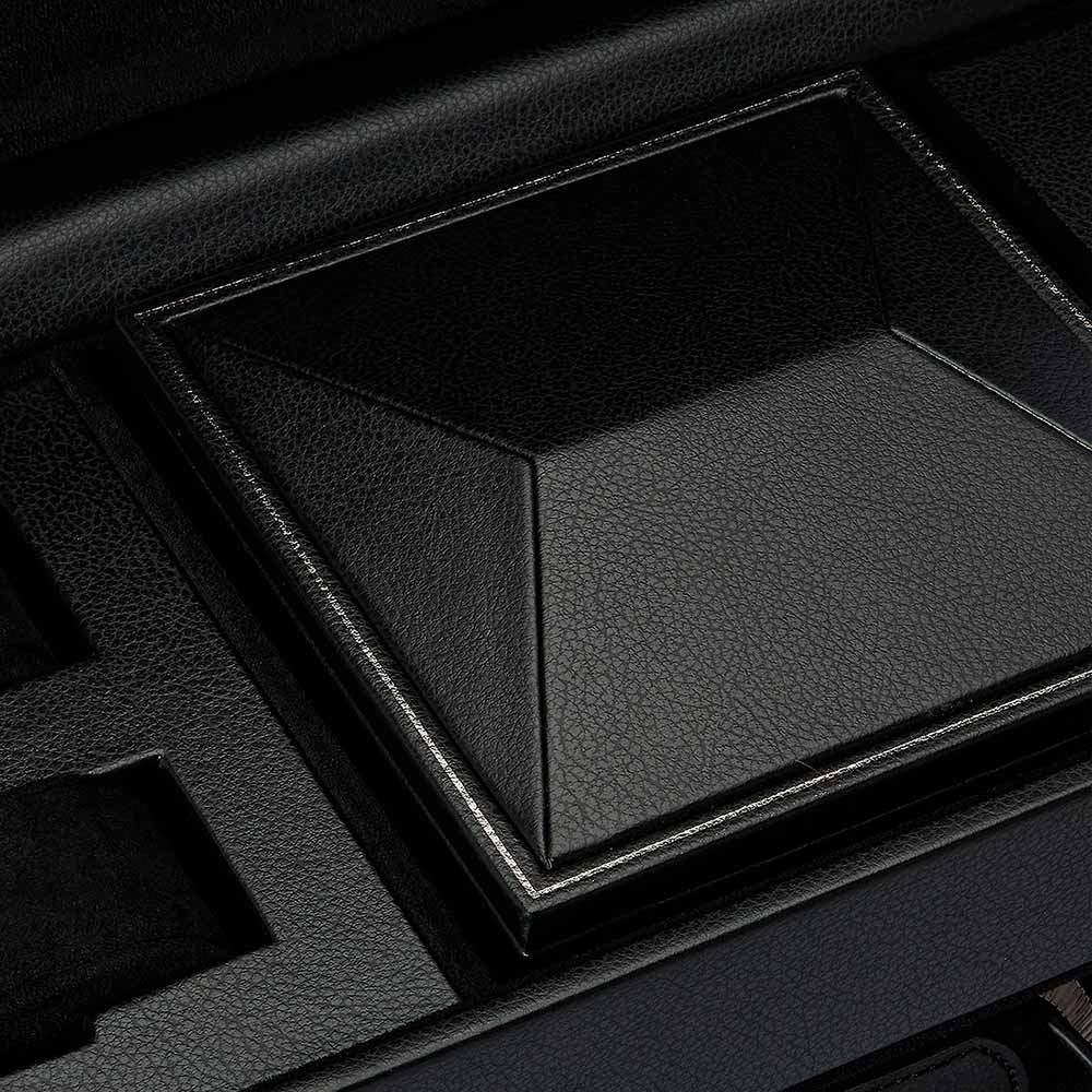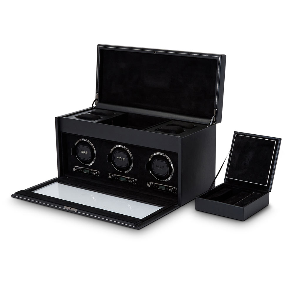 Wysokiej jakości rotomat WOLF British Racing 792302 do nakręcania trzech zegarków z naciągiem automatycznym. Na górze znajduje się dodatkowo schowek na przechowywanie 4 zegarków na poduszkach i 1 w wydzielonej sekcji podróżnej z klapką. Ręcznie wykonana obudowa z najwyższej jakości skóry wegańskiej ozdobiona elementami w kolorze czarnym. Szklana szyba chroni zegarek oraz wnętrze rotomatu przed kurzem i zabrudzeniami. Możliwość zamknięcia rotomatu za pomocą kluczyka. Ekskluzywny design rotomatu WOLF British Racing sprawia, że jest jednym z najchętniej wybieranych modeli na rynku akcesoriów do zegarków automatycznych.