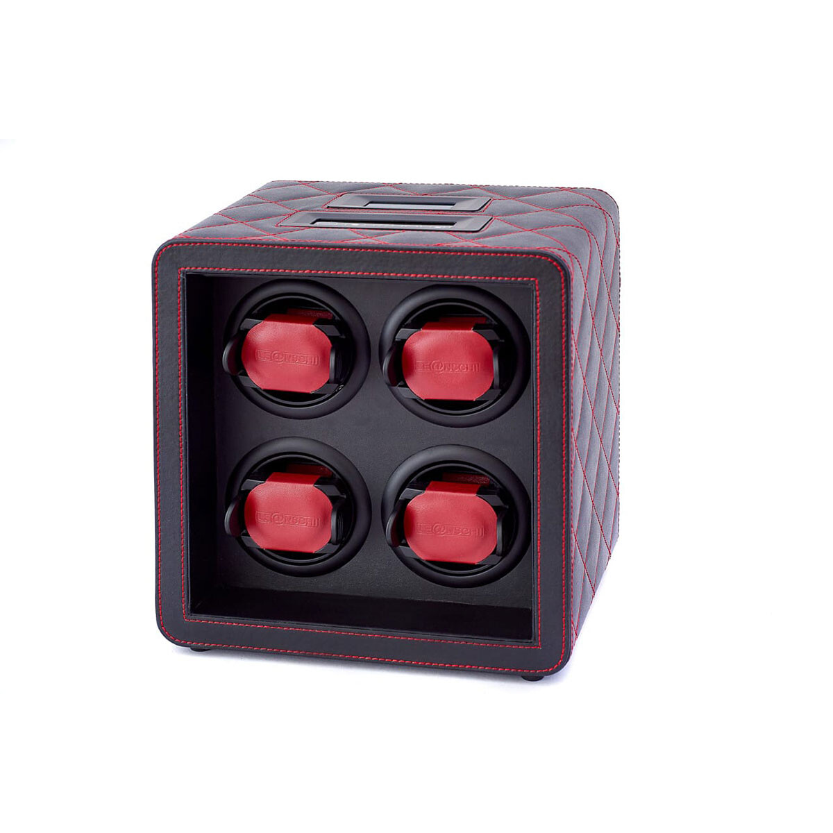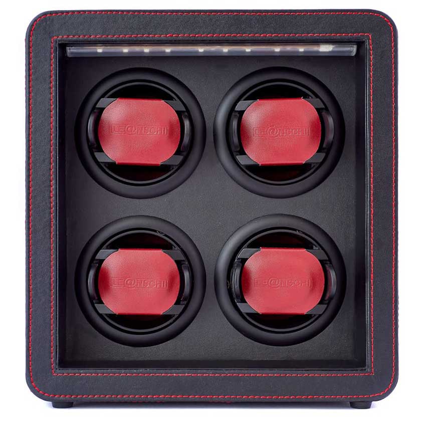 Rotomat Leanschi WM04-BRED na 4 zegarki w kolorze czarnym z czerwonym obszyciem. Wysokiej jakości urządzenie do nakręcania zegarków z naciągiem automatycznym. Elegancka wersja wykonana z drewna obszyta czarną wegańską skórą. Kontrolowany za pomocą diod LED PAD umieszczony na górze urządzenia umożliwia szybkie i łatwe ustawienia. Nie ma potrzeby pobierania żadnej aplikacji ani oprogramowania, nie ma potrzeby aktualizacji i parowania. Każdym bębnem rotomatu można indywidualnie sterować: w ruchu utrzymywane są tylko te zegarki, które chcemy.