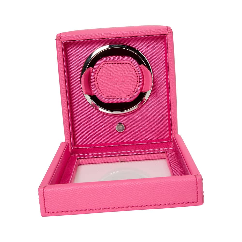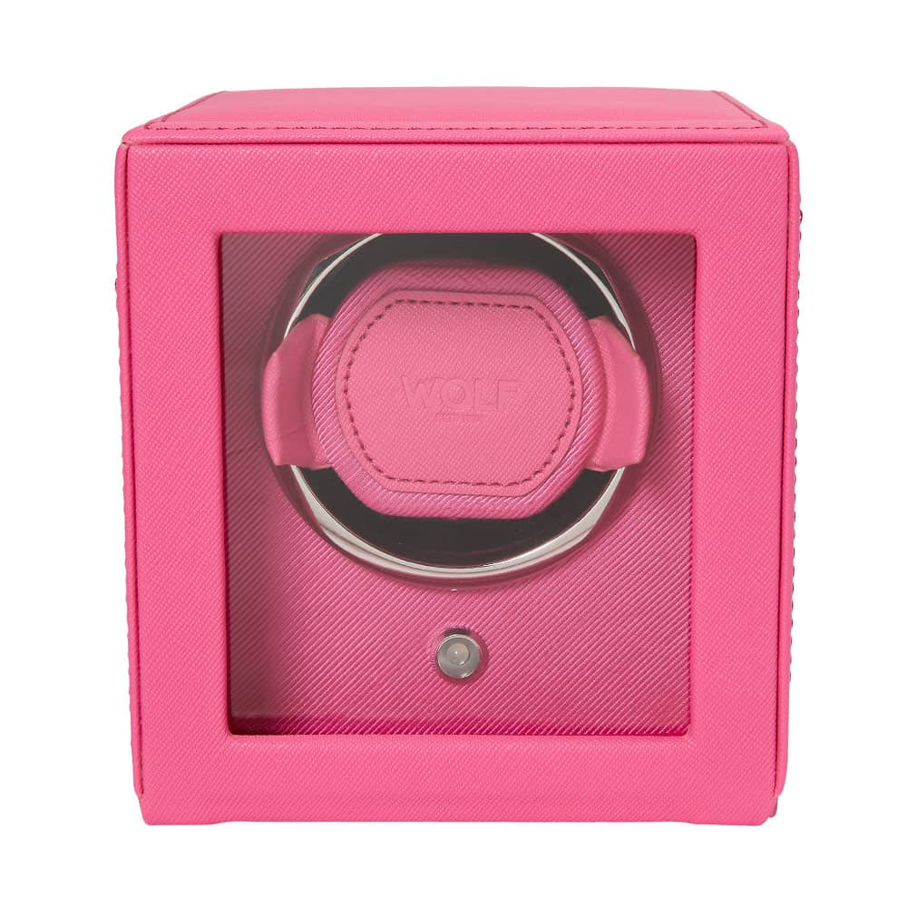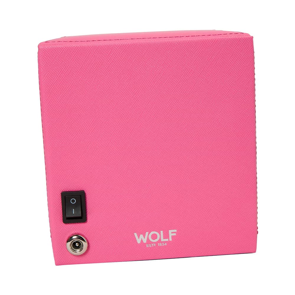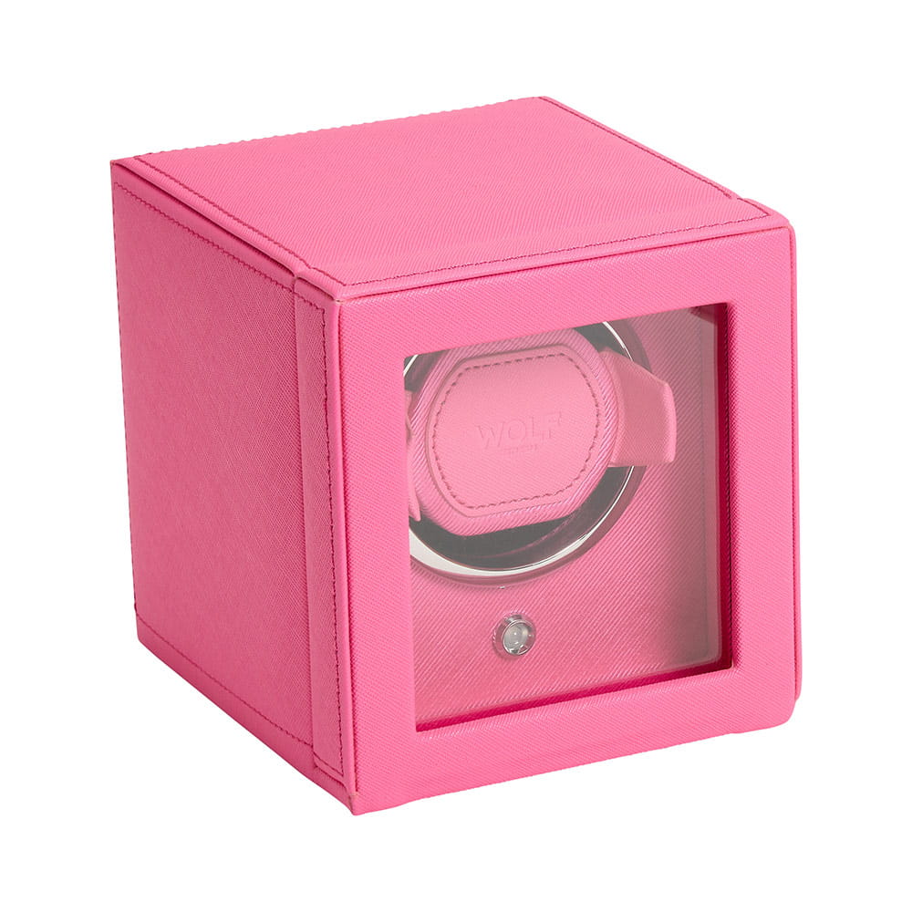 Rotomat WOLF Cub 461190 na 1 zegarek z możliwością przechowania. Kwadratowy rotomat wykończony wegańską skórą w kolorze różowym. WOLF Cub to rotomat dwukierunkowy posiadający opatentowane rozwiązania dostępne wyłącznie w marce WOLF. Rotomat ten liczy dokładną liczbę obrotów, co pozwala z niezwykłą precyzją dbać o kondycję mechanizmu swojego zegarka. Wszystkie inne rotomaty, szacują tylko liczbę obrotów na podstawie interwałów czasowych.