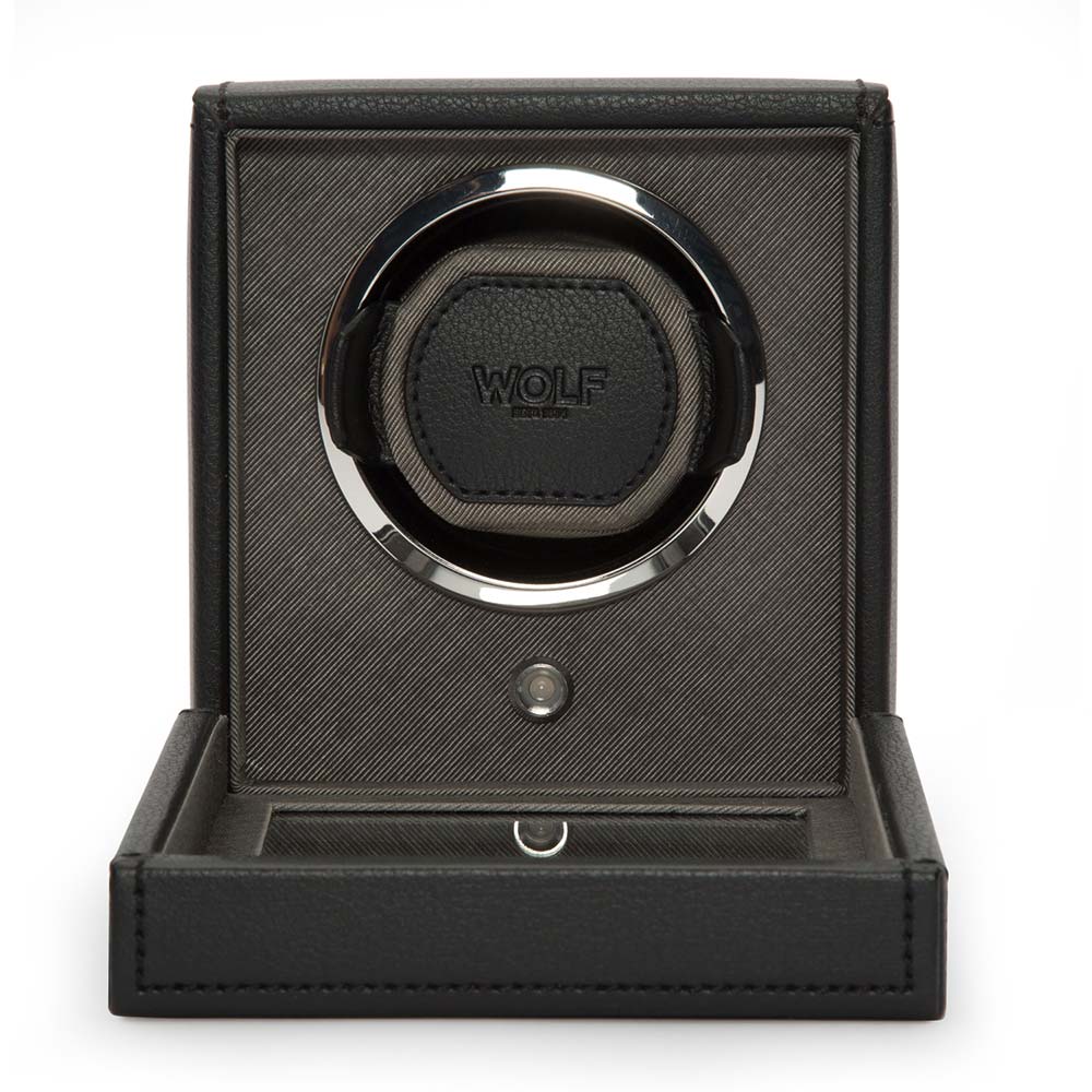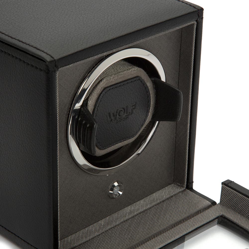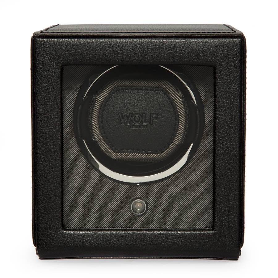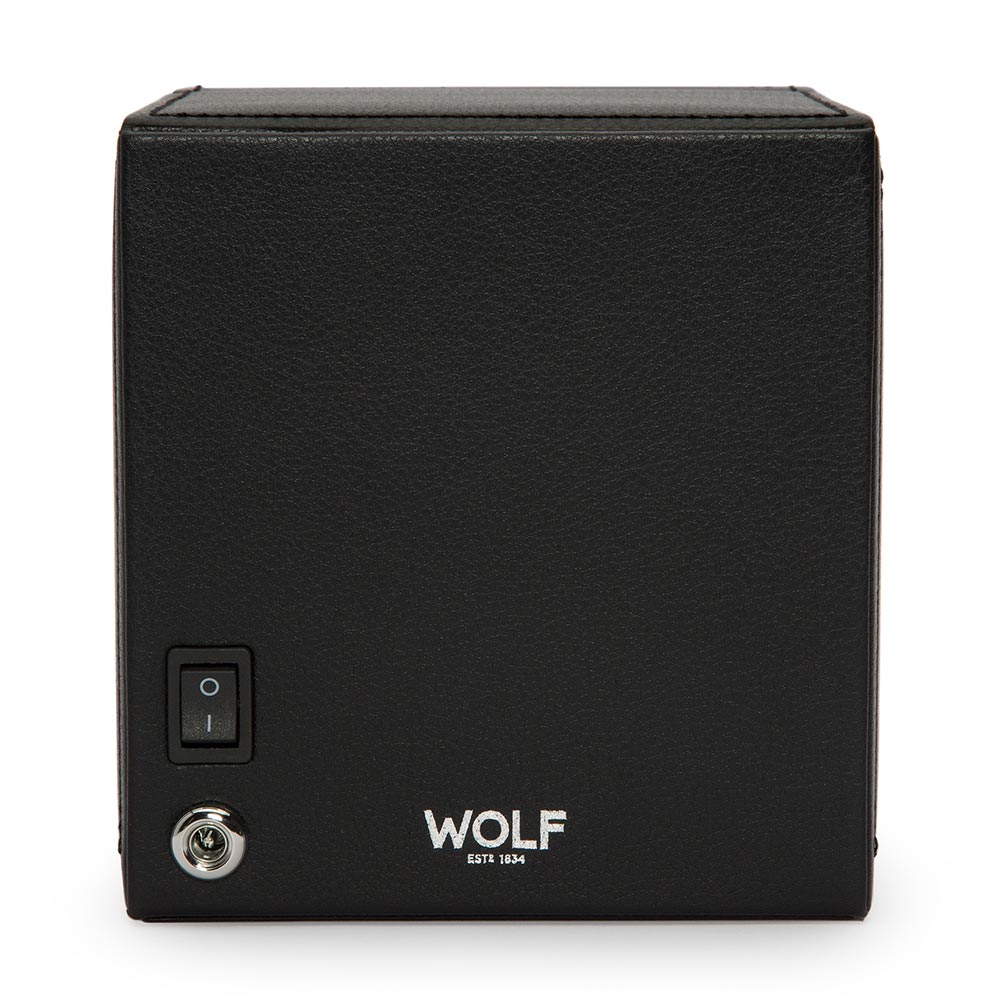 Wysokiej jakości niemieckiej produkcji, rotomat do nakręcania zegarka z naciągiem automatycznym. Obudowa wykonana ręcznie z najwyższej jakości czarnej licowej skóry podkreśla najwyższą jakość i dbałość o szczegóły. Szklana szyba w otwieranej pokrywie chroni zegarek oraz wnętrze rotomatu przed kurzem i zabrudzeniami. Ekskluzywny design WOLF Cub Winder With Cover sprawia, że jest jednym z najchętniej wybieranych modeli na rynku akcesoriów do zegarków automatycznych. Zegarek umieszczony w rotomacie wygląda efektownie, co przyczynia się do uatrakcyjnienia o ciekawą ozdobę wnętrza każdego stylowego pomieszczenia.