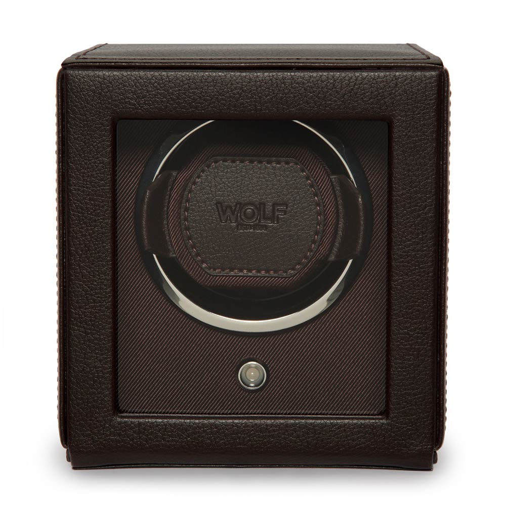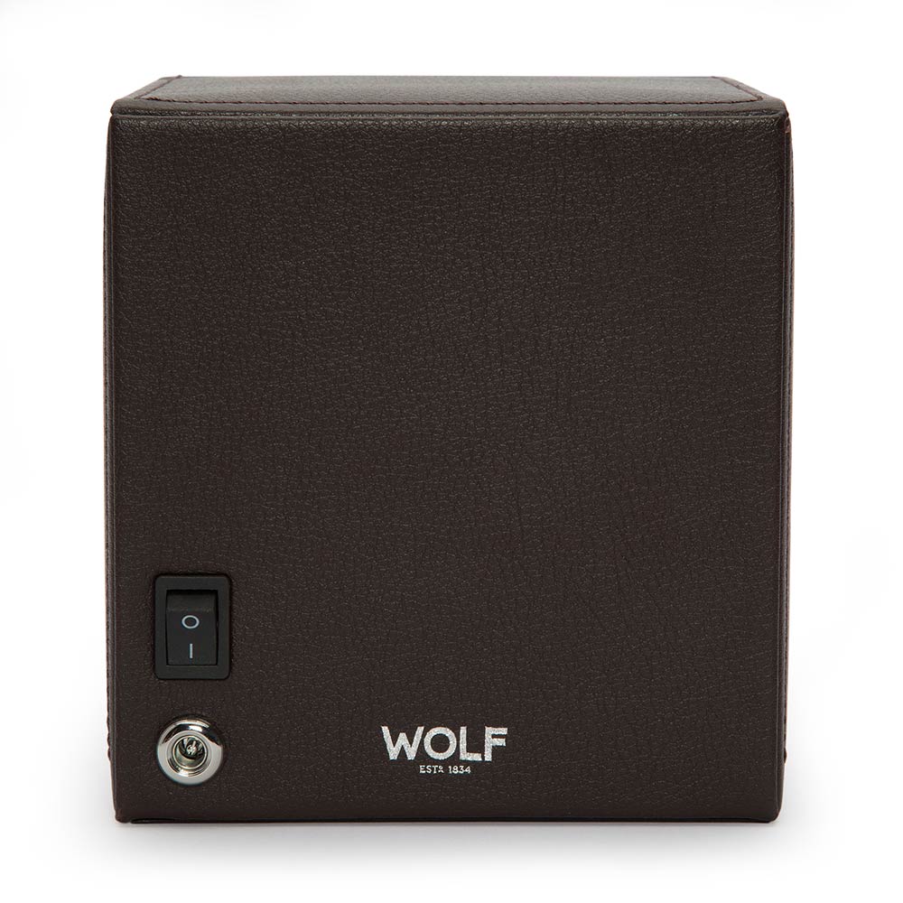 Wysokiej jakości niemieckiej produkcji, rotomat do nakręcania zegarka z naciągiem automatycznym. Obudowa wykonana ręcznie z najwyższej jakości brązowej licowej skóry podkreśla najwyższą jakość i dbałość o szczegóły. Szklana szyba w otwieranej pokrywie chroni zegarek oraz wnętrze rotomatu przed kurzem i zabrudzeniami. Ekskluzywny design WOLF Cub Winder With Cover sprawia, że jest jednym z najchętniej wybieranych modeli na rynku akcesoriów do zegarków automatycznych. Zegarek umieszczony w rotomacie wygląda efektownie, co przyczynia się do uatrakcyjnienia o ciekawą ozdobę wnętrza każdego stylowego pomieszczenia.
