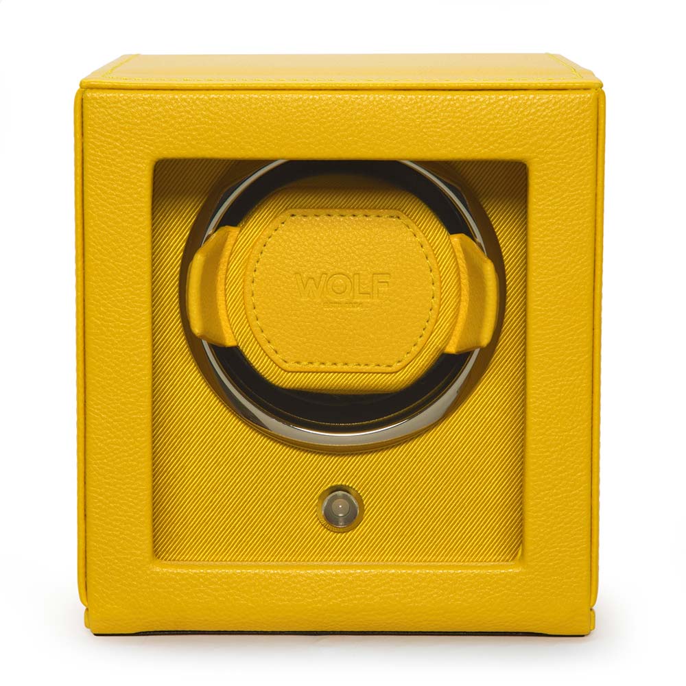 Rotomat WOLF Cub Winder With Cover 46192 na 1 zegarek. Wysokiej jakości niemieckiej produkcji, nawijarka do nakręcania zegarka z naciągiem automatycznym. Obudowa wykonana ręcznie z najwyższej jakości żółtej licowej skóry podkreśla najwyższą jakość i dbałość o szczegóły. Szklana szyba w otwieranej pokrywie chroni zegarek oraz wnętrze rotomatu przed kurzem i zabrudzeniami. Ekskluzywny design WOLF Cub Winder With Cover sprawia, że jest jednym z najchętniej wybieranych modeli na rynku akcesoriów do zegarków automatycznych. Zegarek umieszczony w rotomacie wygląda efektownie, co przyczynia się do uatrakcyjnienia o ciekawą ozdobę wnętrza każdego stylowego pomieszczenia.