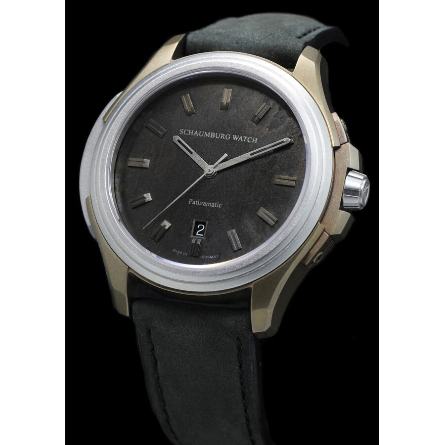 Koperta o średnicy 45 mm wykonana jest ze stali szlachetnej z matową powierzchnią, co nadaje jej ciekawego charakteru. Elementy w odcieniu brązu w rzeczywistości są pokryte patyną. Rozmiar czasomierza jest dość duży, ale jego design i kształt sprawiają, że nie jest przesadnie wielki. Do ustawiania czasu służy zakręcana stalowa koronka z logo firmy. Ten sam kolor stalowy znajduje się na piaskowanym pierścieniu oraz na drugim boku obudowy. Zakręcany dekiel, również w kolorze stalowym, uszczelnia konstrukcję do 10 barów 100m. Najważniejszym elementem Schaumburg Patinamatic jest jego tarcza, również ozdobiona patynowaniem. Każda sztuka zegarka będzie miała inny odcień i wzór, ponieważ jest ona ręcznie produkowana i wykańczana. Taki zabieg sprawia, że każdy zegarek Patinamatic jest unikatowy i inny od reszty. Na samym dole cyferblatu znajduje się czarny datownik. Odporne na zarysowania szkło szafirowe pokryte jest powłoką antyrefleksyjną, która dodaje czytelności.