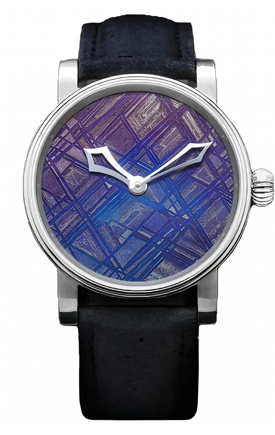 Jednak prawdziwą gwiazdą tego modelu jest jego tarcza, która nadaje zegarkowi kosmiczny charakter. Wykonana z prawdziwego meteorytu, wyróżnia się niezwykłym wzorem przypominającym strukturę Widmanstättena, charakterystyczną dla meteorytów żelaznych. Przeplatające się linie w odcieniach fioletu, niebieskiego i srebra tworzą niemal hipnotyzujący efekt, przypominający powierzchnię odległej planety lub fragment nieba nocą. Szkieletowe wskazówki zegarka Schaumburg Meteorite SCH-NWME, które kształtem przypominają miecze, dodają tarczy drapieżnego, ale jednocześnie wyrafinowanego charakteru. Kontrastują one z kosmicznym tłem, zapewniając czytelność i podkreślając dbałość o detale. Dzięki swojej niepowtarzalności każda tarcza jest jedyna w swoim rodzaju – tak samo unikalna, jak historia, którą skrywa.