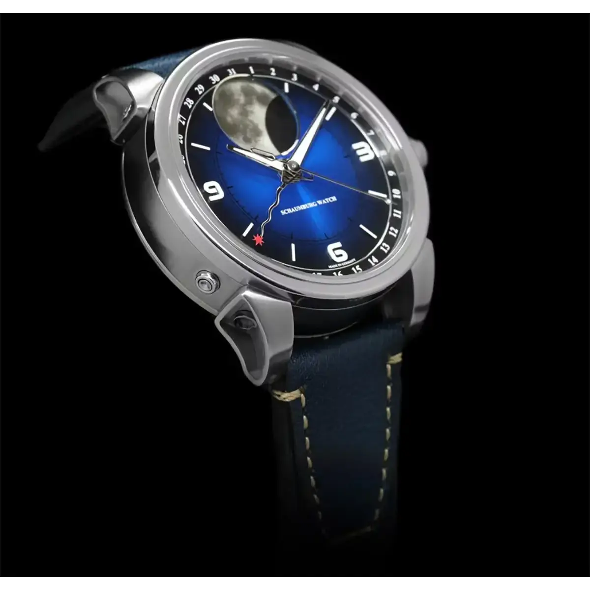 Schaumburg SCH-MOONPR1 umożliwia zaawansowaną personalizację astronomiczną dzięki przyciskowi na godzinie ósmej, który pozwala dostosować pozycję cienia księżyca dla obserwatorów znajdujących się na półkuli północnej lub południowej. Stalowa koperta o średnicy 43 mm skrywa modyfikowany automatyczny kaliber Sellita SW-11, a całość dopełnia ręcznie szyty skórzany pasek w kolorze niebieskim. Model ten łączy w sobie rzemieślniczą precyzję niemieckiej manufaktury z fascynacją kosmosem.