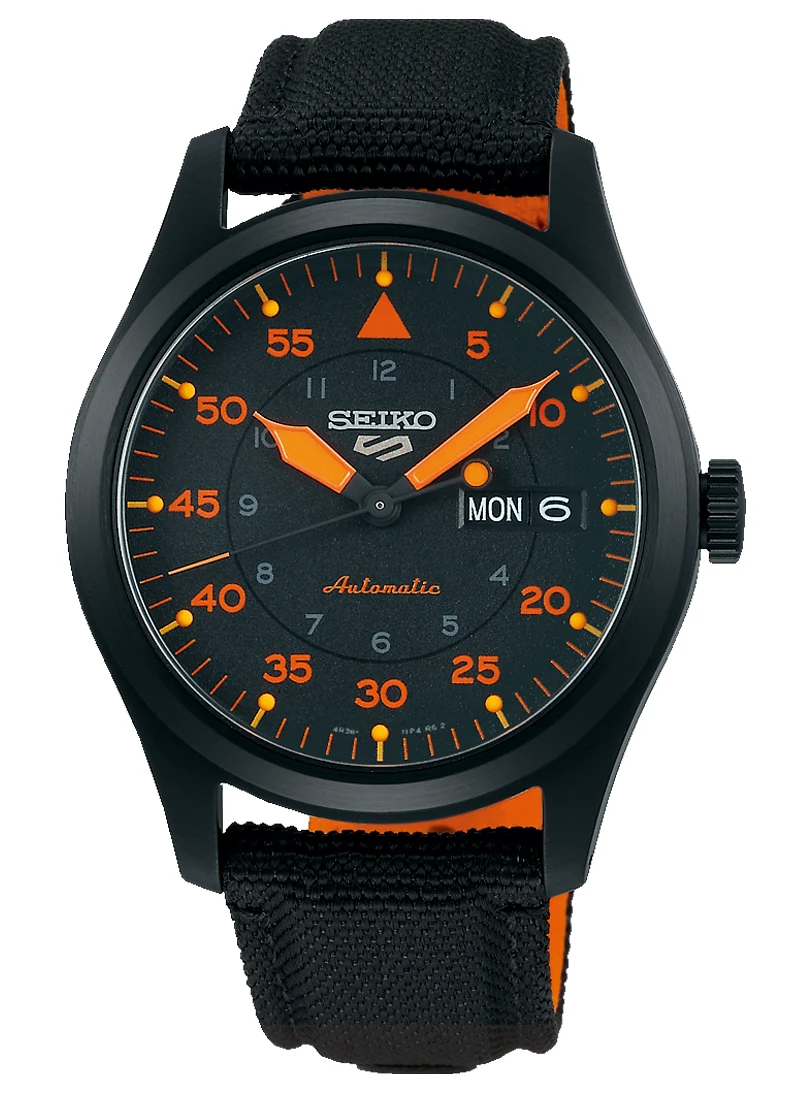 Japoński zegarek o militarno-lotniczym designie z mechanizmem 4R36 z ręcznym naciągiem i rezerwą chodu do 41h, zakrzywionym szkłem Hardlex, nylonowym paskiem inspirowanym „kurtką bomber” i stalową kopertą z czarną powłoką PVD.