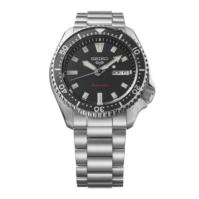 Zegarek męski Seiko 5 Sports SKX Redux in Kuro Black to model, który nawiązuje do legendarnej linii diverów z 1998 roku, ale zachowuje własny, rozpoznawalny charakter. Solidna koperta ze stali szlachetnej o średnicy 42.50 mm została zestawiona z klasyczną bransoletą, a jej wyraźnym akcentem jest koronka osadzona nietypowo na godzinie czwartej – rozwiązanie, które zwiększa komfort noszenia i minimalizuje ryzyko przypadkowego zahaczenia. Mineralne szkło Hardlex chroni tarczę przed uszkodzeniami mechanicznymi, a jednokierunkowa luneta z wyraźną podziałką podkreśla sportowe DNA tego modelu. Ten sportowy zegarek Seiko posiada klasę szczelności do 100 metrów, co zapewnia bezpieczeństwo mechanizmowi nawet w czasie pływania.