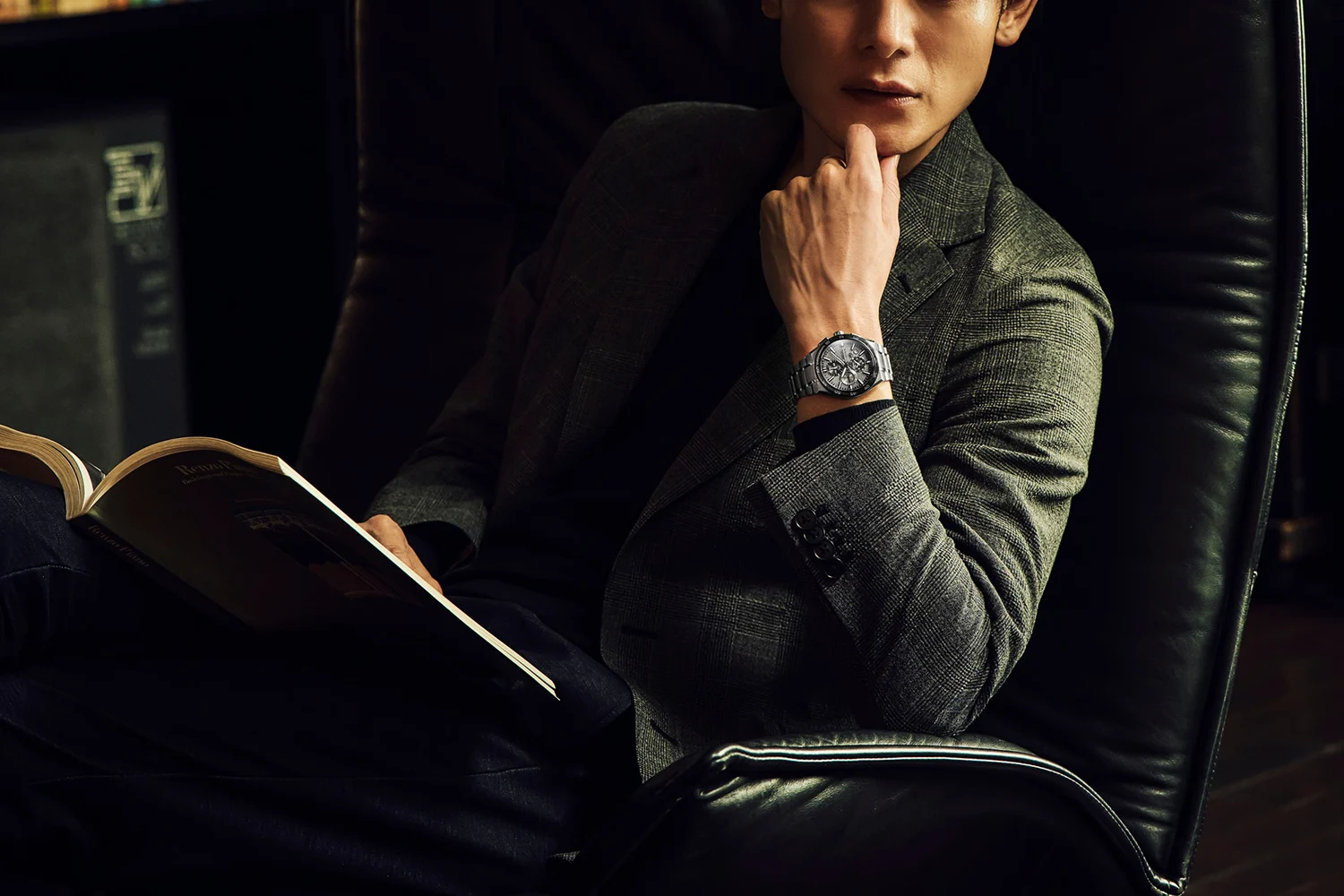 Koperta o średnicy 44,1 mm i grubości 14,4 mm wykonana została z tytanu o supertwardej powłoce, co zapewnia imponującą odporność na zarysowania przy zachowaniu lekkości. Zegarek posiada wodoodporność 10 barów oraz odporność magnetyczną 4 800 A/m. Tytanowa bransoleta z pięcioelementową konstrukcją i funkcją Smart Adjuster pozwala na błyskawiczne dopasowanie długości, oferując maksymalny komfort noszenia. Czarny pierścień z naniesioną skalą dodaje sportowego, dynamicznego akcentu.