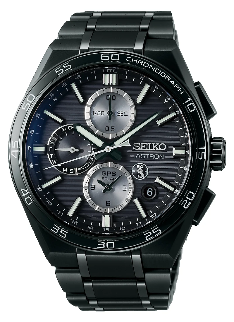 Seiko Astron GPS Solar Dual Time Chronograph SSH179J1 to wyrafinowany zegarek męski, który łączy zaawansowaną technologię GPS Solar z nowoczesnym, eleganckim stylem. W pełni czarna, tytanowa konstrukcja z polerowanym wykończeniem i tarczą w odcieniu grafitowego antracytu nadaje mu wyjątkowego charakteru – to zegarek, który emanuje mocą, precyzją i klasą.