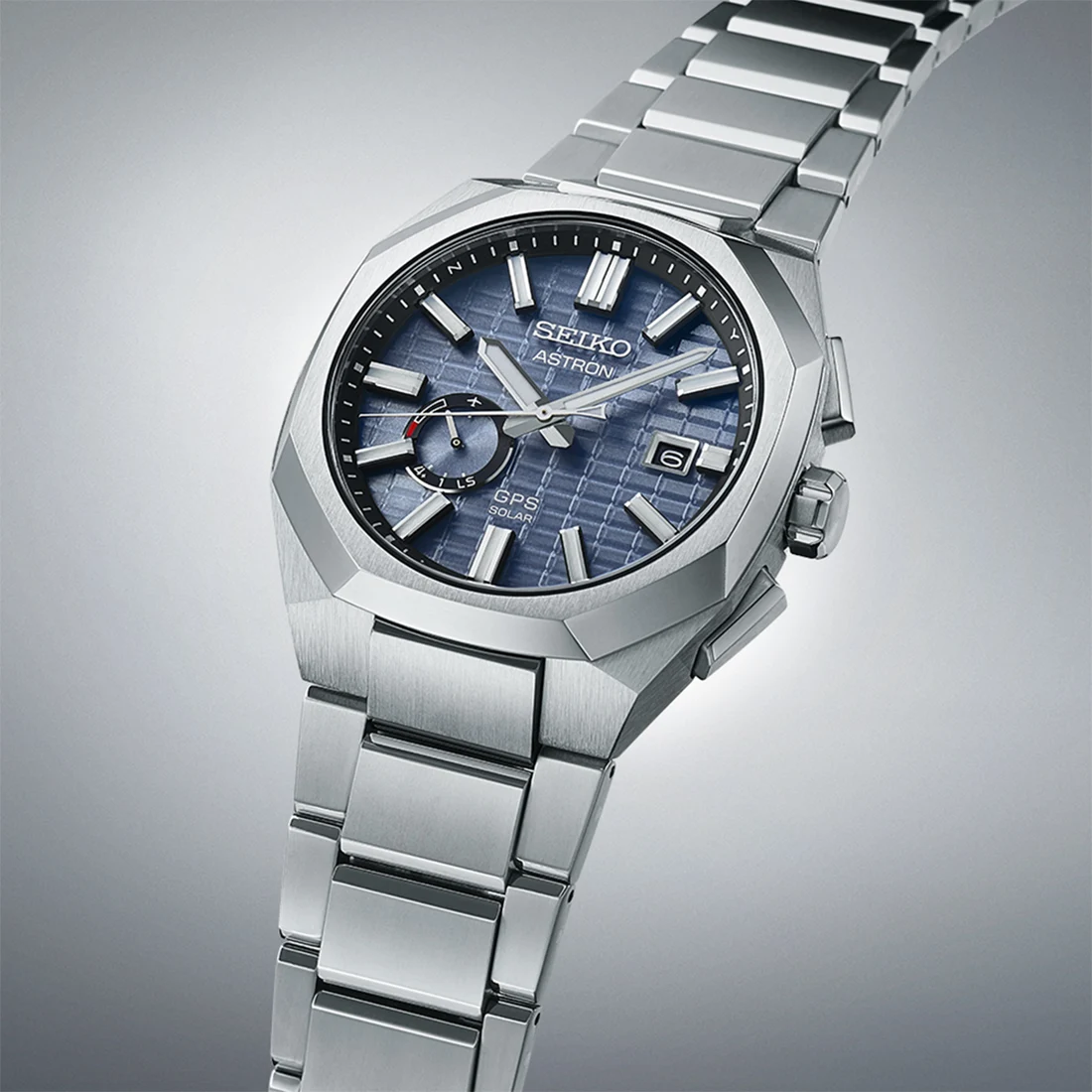 Pod szkłem szafirowym z powłoką Super-Clear znajduje się niebieska tarcza o strukturze inspirowanej kryształem kwarcu, która subtelnie zmienia odcień w zależności od kąta padania światła. Geometryczny wzór i wyraziste indeksy z masą LumiBrite zapewniają doskonałą czytelność, a okno datownika na godzinie trzeciej dodaje funkcjonalnego charakteru. Wskazówka małego sekundnika na godzinie ósmej pełni jednocześnie rolę wskaźnika poziomu naładowania i trybu pracy GPS.