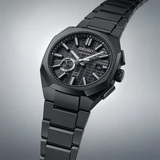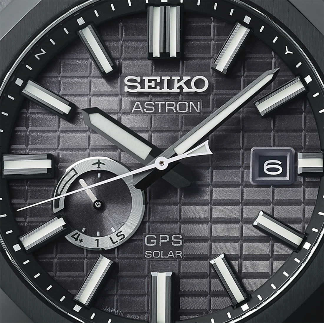 Pod szafirowym szkłem z powłoką Super-Clear rozpościera się grafitowa tarcza z tłoczeniem inspirowanym strukturą kryształu kwarcu, nawiązującą do dziedzictwa oryginalnego Astrona z 1969 roku. Wzór subtelnie załamuje światło, podkreślając industrialny charakter kompozycji. Wskazówki i indeksy z powłoką LumiBrite gwarantują doskonałą czytelność po zmroku, a datownik na godzinie trzeciej zapewnia praktyczne uzupełnienie funkcji. Na subtarczy przy godzinie ósmej umieszczono wskaźnik poziomu energii i trybu GPS.