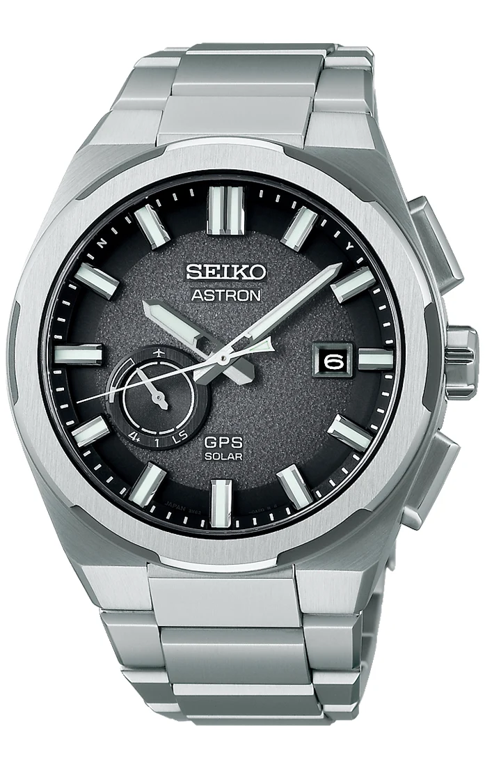 Seiko Astron SSJ025J1 tytanowy GPS Solar inspirowany Księżycem, z mechanizmem 3X62, dwuwarstwowym bezelem i fakturowaną szarą tarczą.