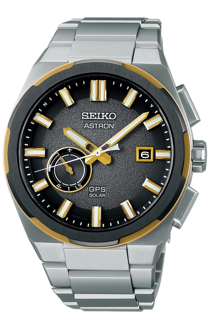 Seiko Astron SSJ026J1 tytanowy GPS Solar z czarnym pierścieniem i złotymi akcentami, mechanizmem 3X62 i globalną synchronizacją czasu.