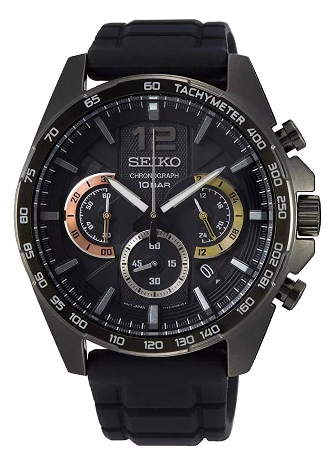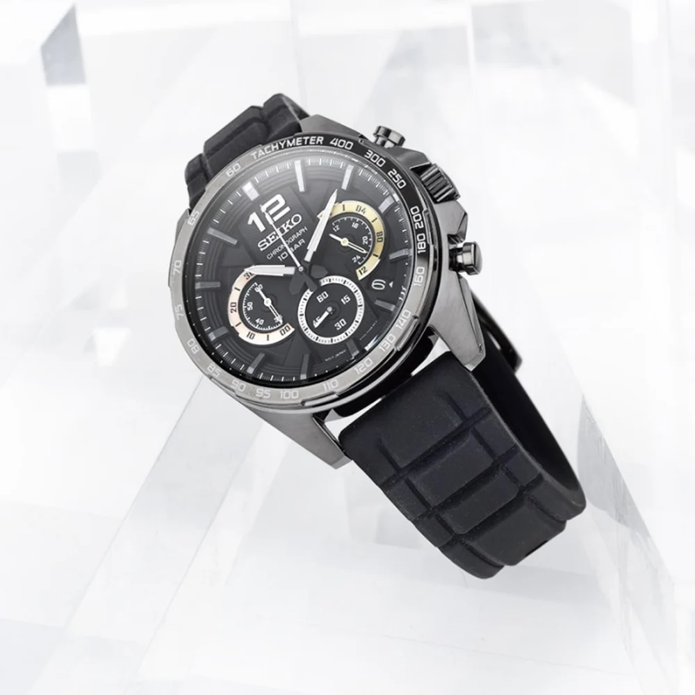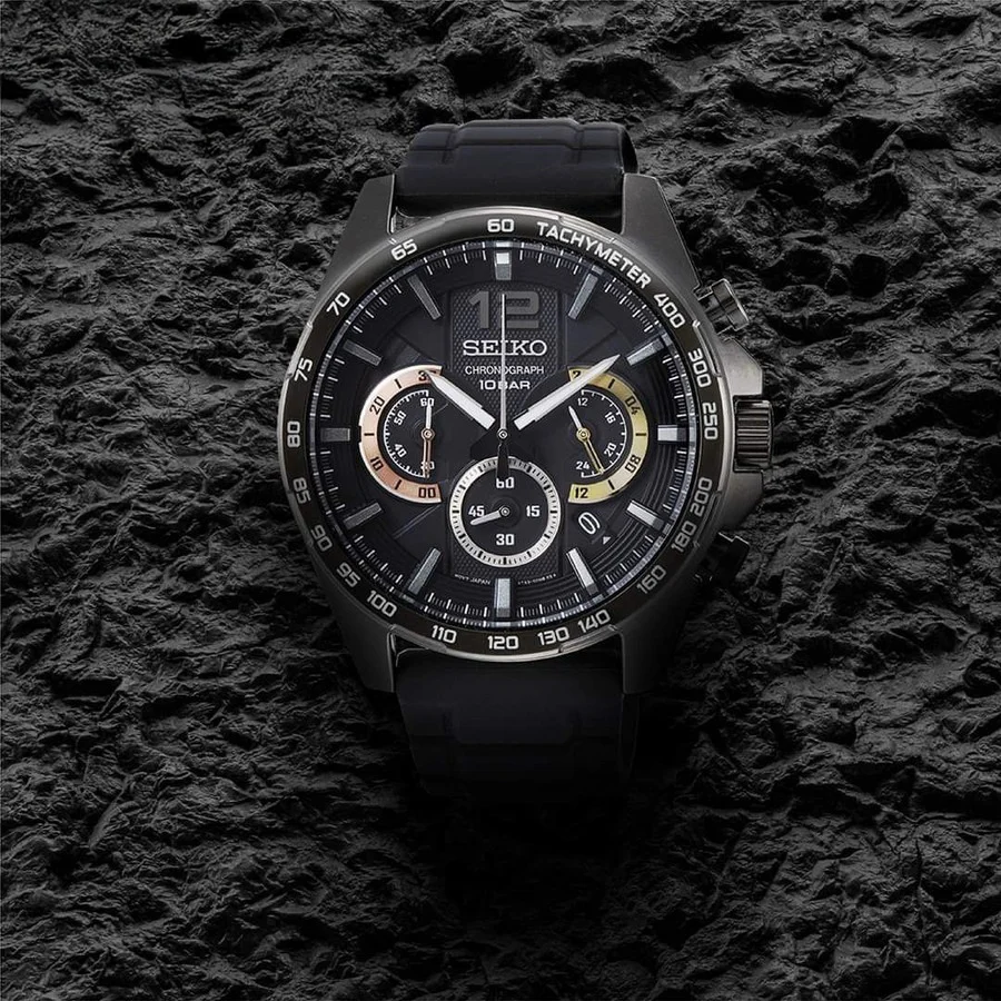 Seiko Chronograph SSB349P1 to propozycja dla osób, które lubią wyrazistą, nowoczesną stylistykę utrzymaną w czerni. Ten model został zaprojektowany tak, aby wyglądał masywnie, nowocześnie i zdecydowanie – koperta, tachymetr i elementy tarczy utrzymano w odcieniach czerni i grafitu, które budują efekt „stealth look”. Jedynym kolorystycznym przełamaniem są akcenty złota i miedzi na subtarcza stopera, które nadają zegarkowi szlachetnego, niemal techniczno–premium charakteru.