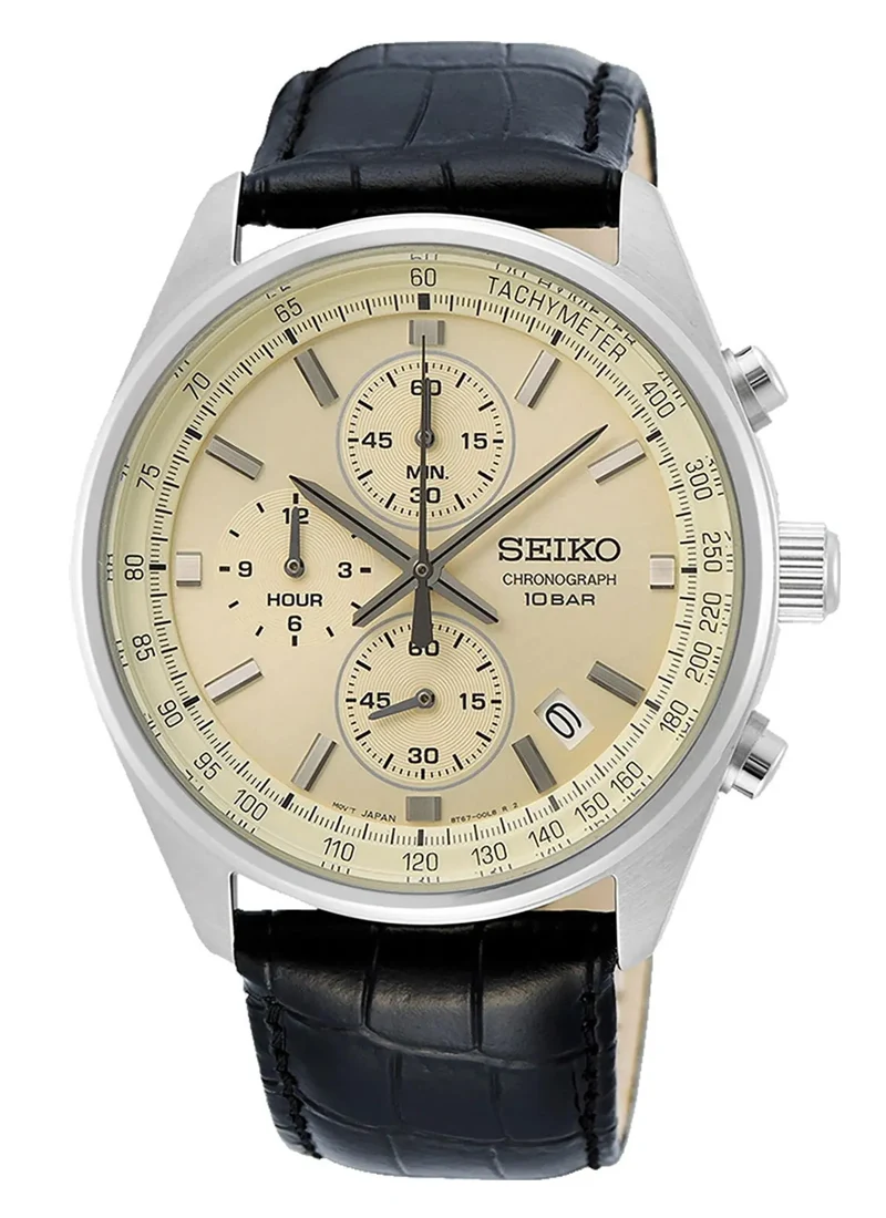 Seiko SSB383P1 to elegancki chronograf z kremową tarczą, skórzanym paskiem i precyzyjnym mechanizmem kwarcowym. Wyposażony w tachymetr i datownik, oferuje 10 bar wodoszczelności oraz trwałe szkło Hardlex.