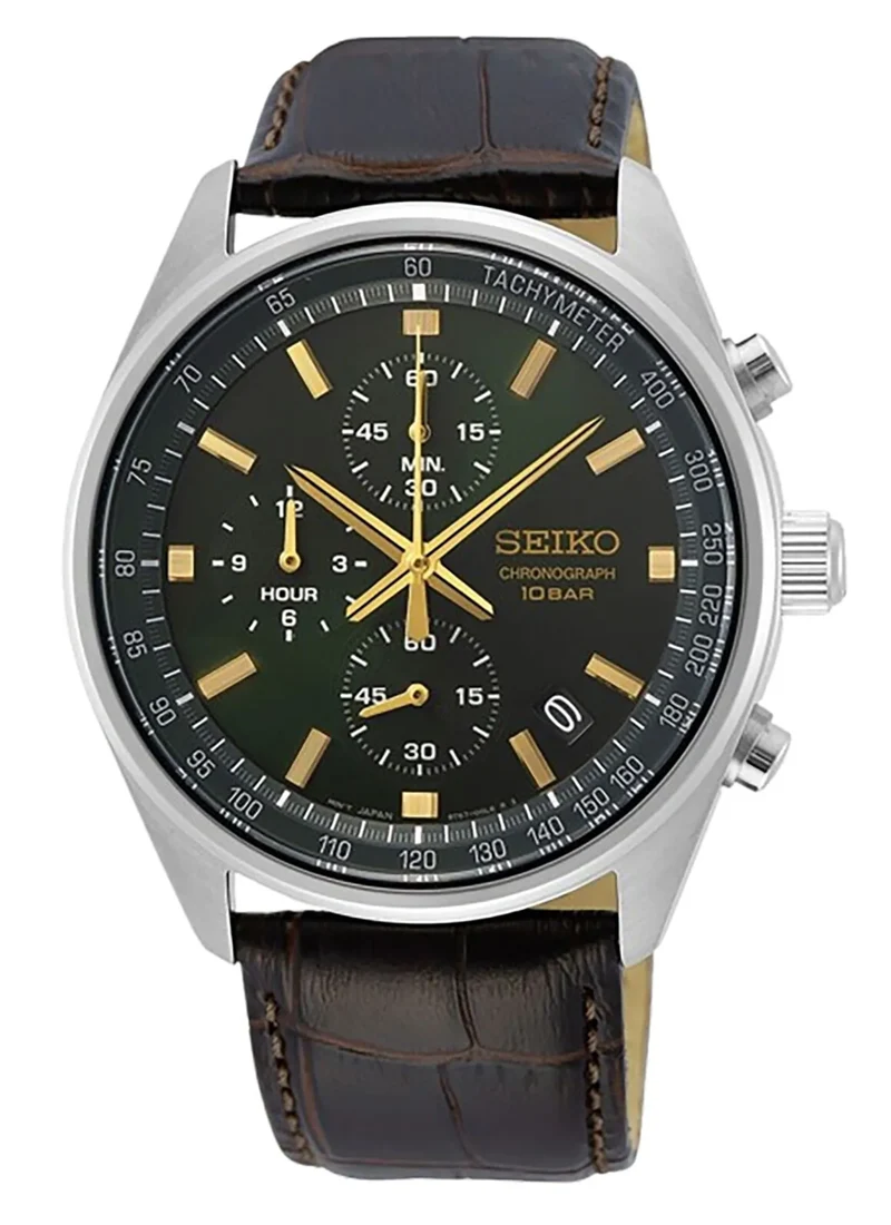 Model Seiko Chronograph SSB385P1 łączy klasyczną stylistykę z nowoczesną funkcjonalnością, tworząc zegarek o eleganckim, ale jednocześnie dynamicznym charakterze. Na ciemnozielonej tarczy umieszczono wyraziste złote indeksy oraz czytelne totalizatory, które podkreślają sportowy rodowód chronografu.