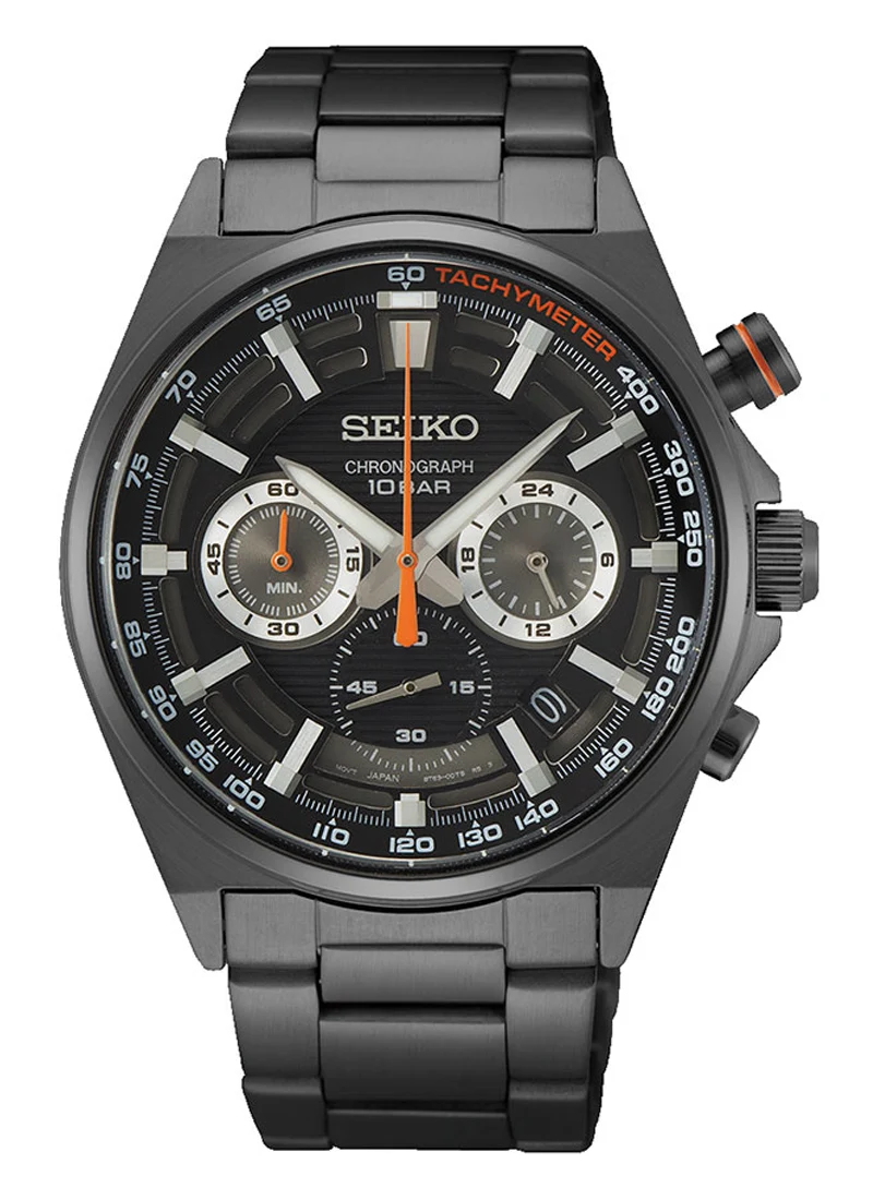 Sportowy zegarek męski Seiko Chronograph SSB399P1. Jest to wyróżniający się model wyposażony w wysoce precyzyjny, japoński mechanizm kwarcowy z komplikacją chronografu i funkcją tachymetru. Jego dynamiczna stylistyka oraz wielowymiarowy cyferblat sprawią, że przyciągnie on uwagę każdego. Ostre linie koperty podkreślają nowoczesny charakter zegarka tak samo jak czarna oprawa oraz kontrastowy pomarańczowy akcent. Średnica obudowy ma wartość 41 milimetrów, a grubość 12 milimetrów, dzięki czemu ten zegarek z chronografem Seiko dopasuje się do nadgarstka w każdym rozmiarze.