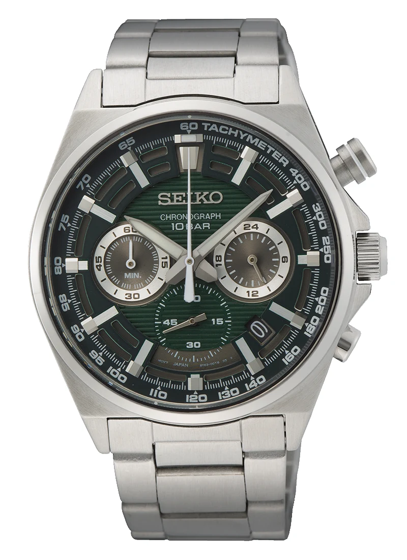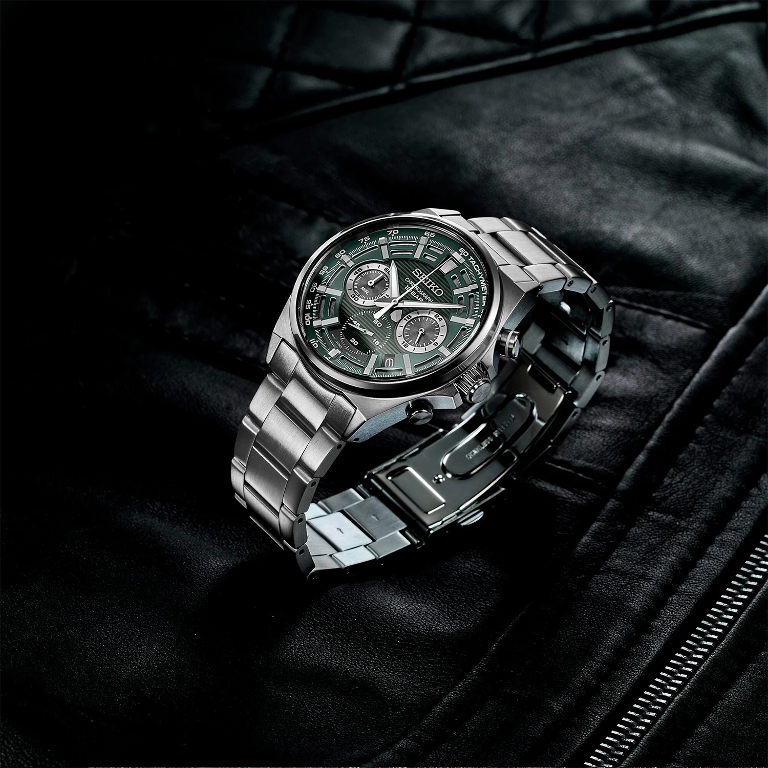 Seiko SSB405P1 to sportowy chronograf ze stalową bransoletą, zieloną tarczą 3D i tachymetrem. Szkło Hardlex i 10 bar wodoszczelności zapewniają trwałość i wygodę.