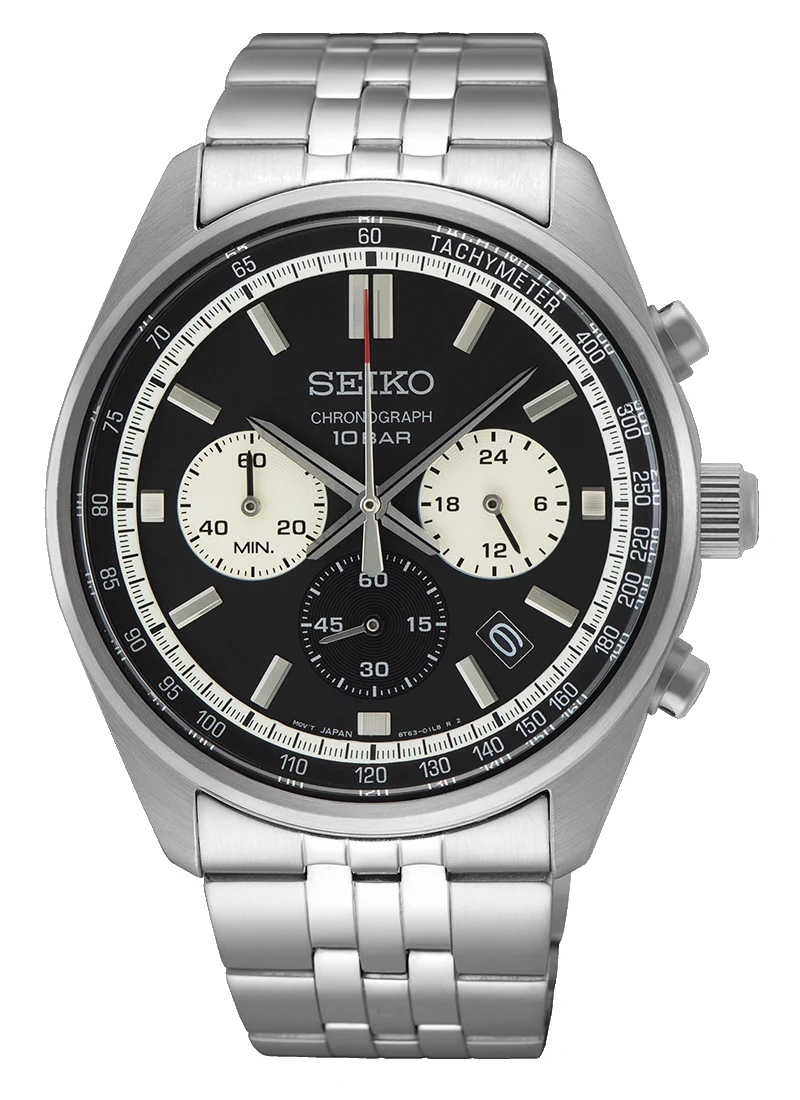 Seiko SSB429P1 to sportowy chronograf o czarnej tarczy typu reverse panda, z tachymetrem, szkłem Hardlex i wodoszczelnością 10 bar. Solidna stalowa bransoleta dopełnia całość.