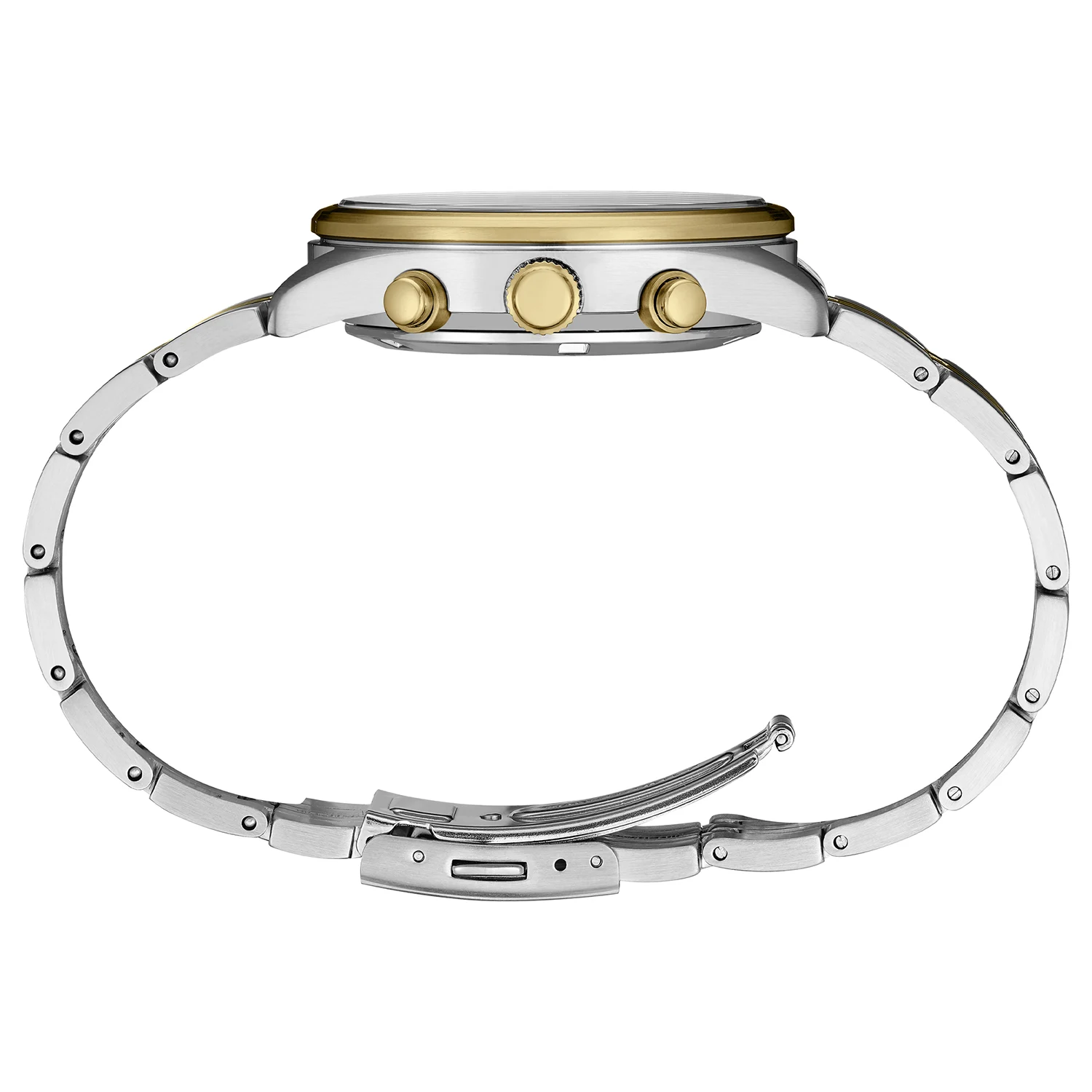 Koperta o średnicy 41,5 mm wykonana została z odpornej na korozję stali szlachetnej, podobnie jak dwukolorowa bransoleta o wielorzędowej konstrukcji. Układ subtarcz zapewnia czytelny podział funkcji: precyzyjny stoper, licznik minut oraz wskazanie czasu w trybie 12/24h. W zewnętrzny pierścień wkomponowano skalę tachymetru, co pozwala mierzyć średnią prędkość na zadanym dystansie. Całość uzupełnia datownik dyskretnie osadzony na godz. 4.
