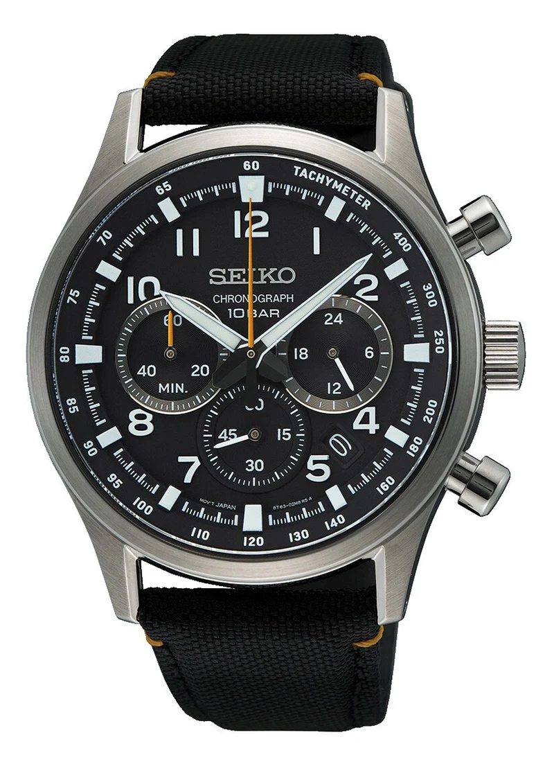 Seiko SSB449P1 to czytelny chronograf w stylu field watch z czarną tarczą, szkłem szafirowym i tachymetrem. Trwały pasek materiałowy i wodoszczelność 10 bar zapewniają swobodę użytkowania.