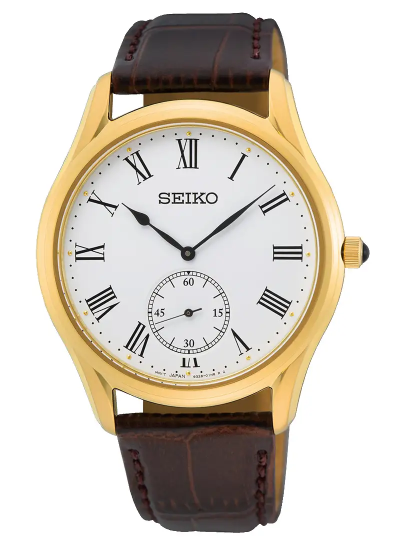 Seiko Classic SRK050P1 to męski zegarek z białą tarczą, rzymskimi indeksami i małym sekundnikiem, uzupełniony złoconą kopertą oraz skórzanym paskiem.